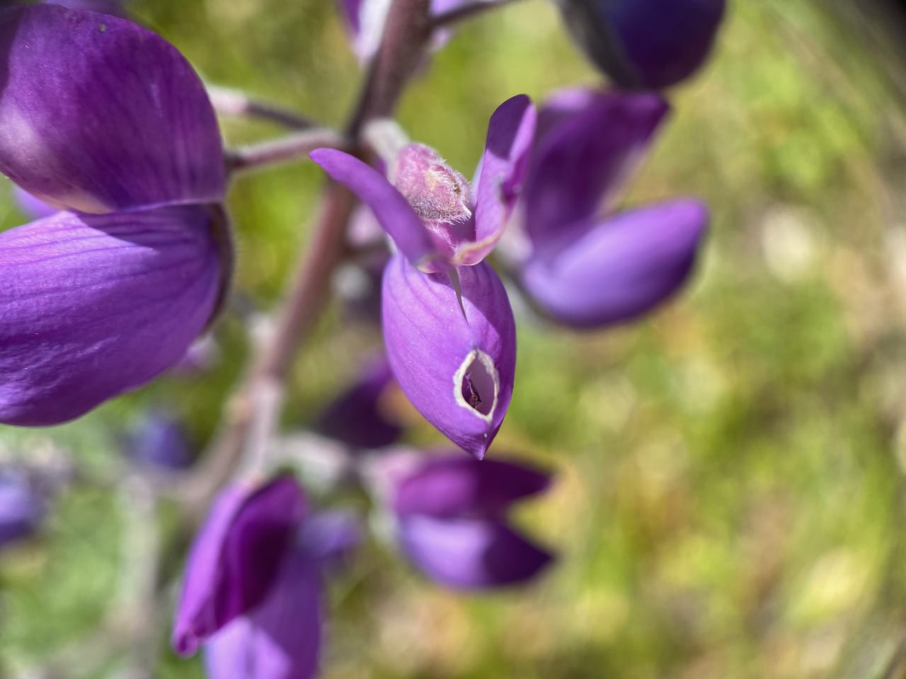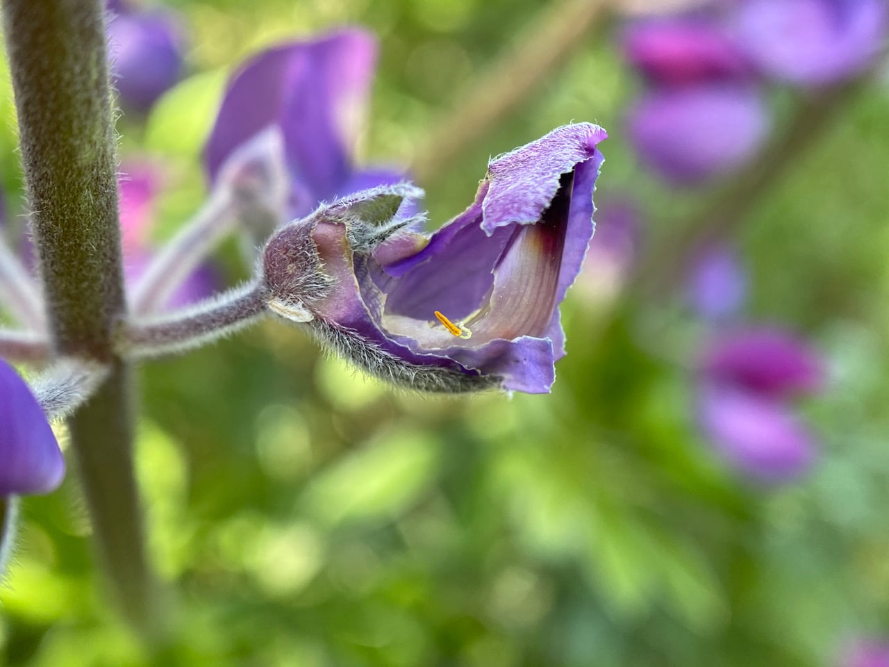 This lupine flower was probably “tripped” by a large queen bumble bee. All the reproductive organs have been extruded through the exposed keel of the flower.