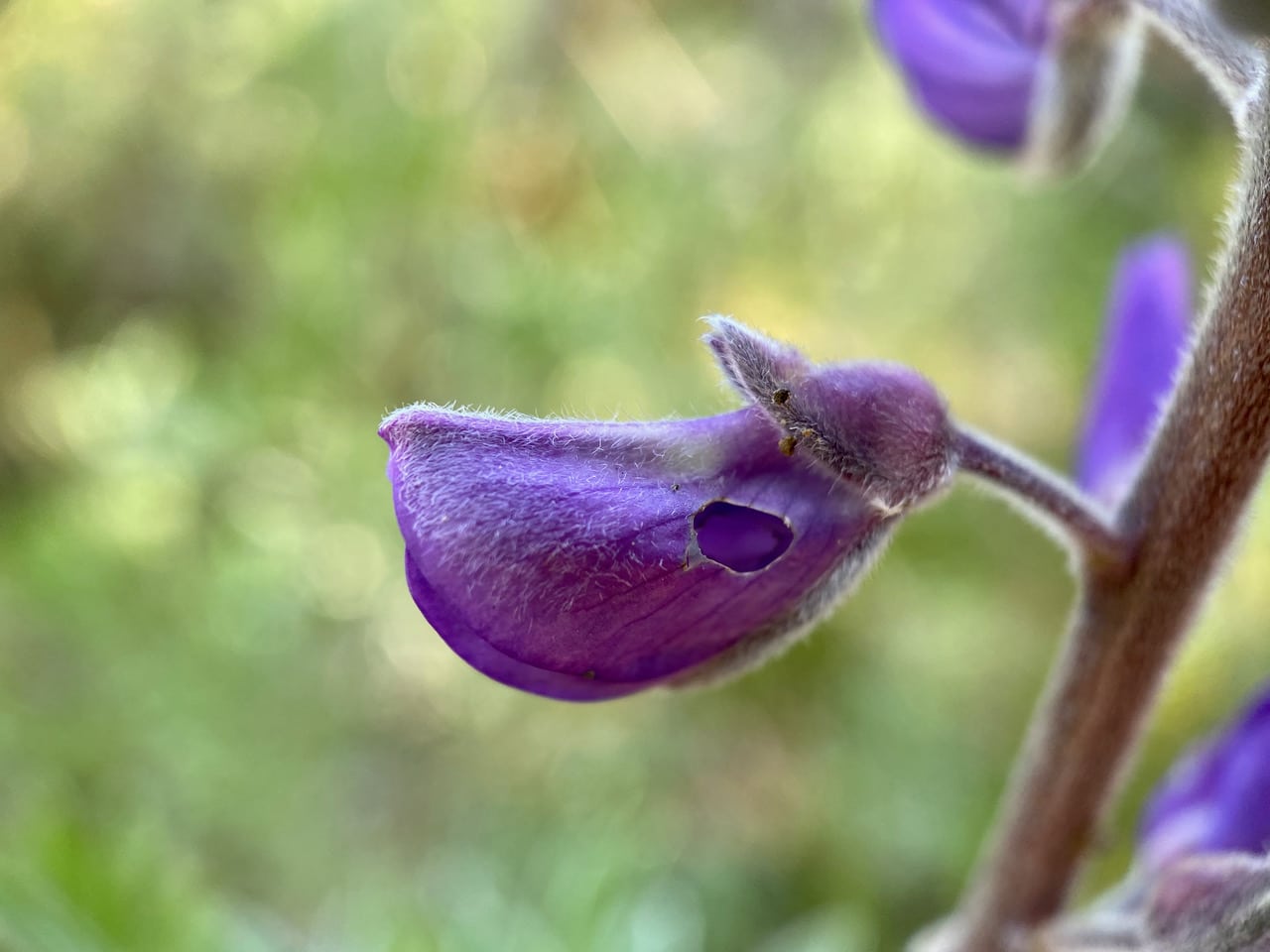 I begin to see damages on the lupine flowers, especially the unopened buds. Someone has chewed through the banner petal of this flower bud.