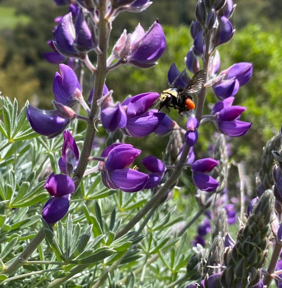 A Yellow-faced Bumble Bee, Bombus vosnesenskii flies around tirelessly to forage on the Silverleaf Lupine flowers. She’s already carrying a huge load of pollen in her pollen baskets. Remarkably bees are able to fly while carrying up to a third of their body weight in pollen.