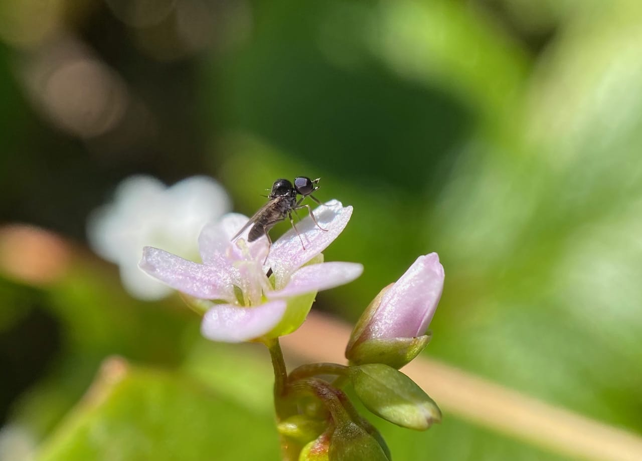 Wow, the insect is a seriously small fly with a distinct humped thorax. It seems to be feeding on the pollen of the flower.