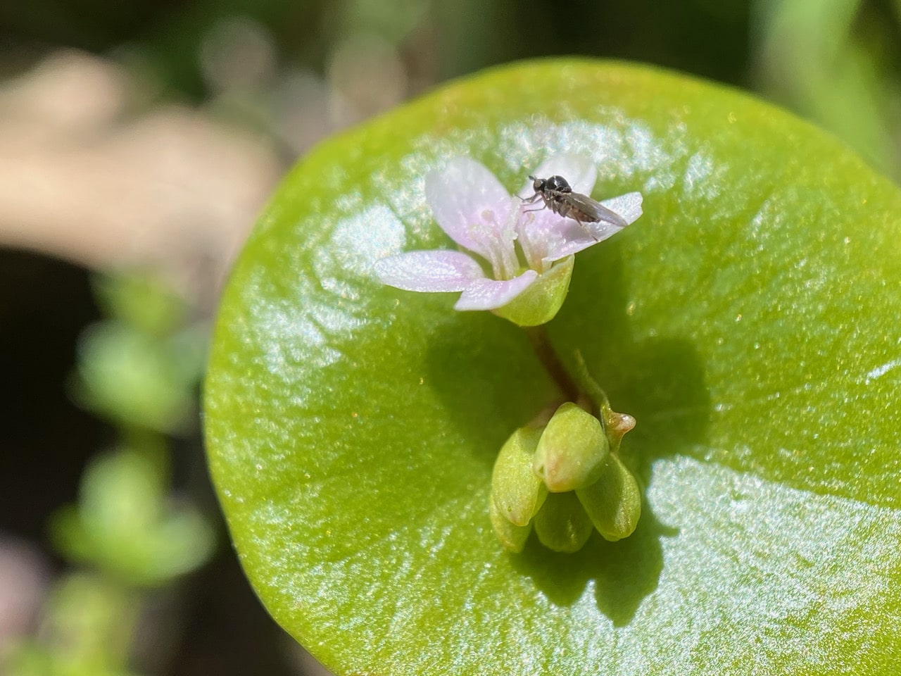 There’s a tiny insect on the Miner’s Lettuce flower, Claytonia perfoliata, no more than 3 mm in length. Time to put on the macro lens!