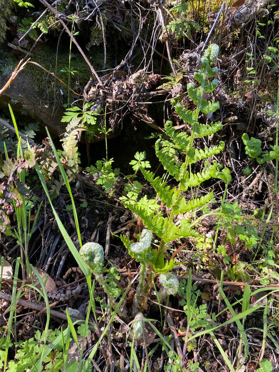 The young fiddleheads of Wood Fern appear to be covered with a plastic wrap that breaks up in shreds as the fronds expand.