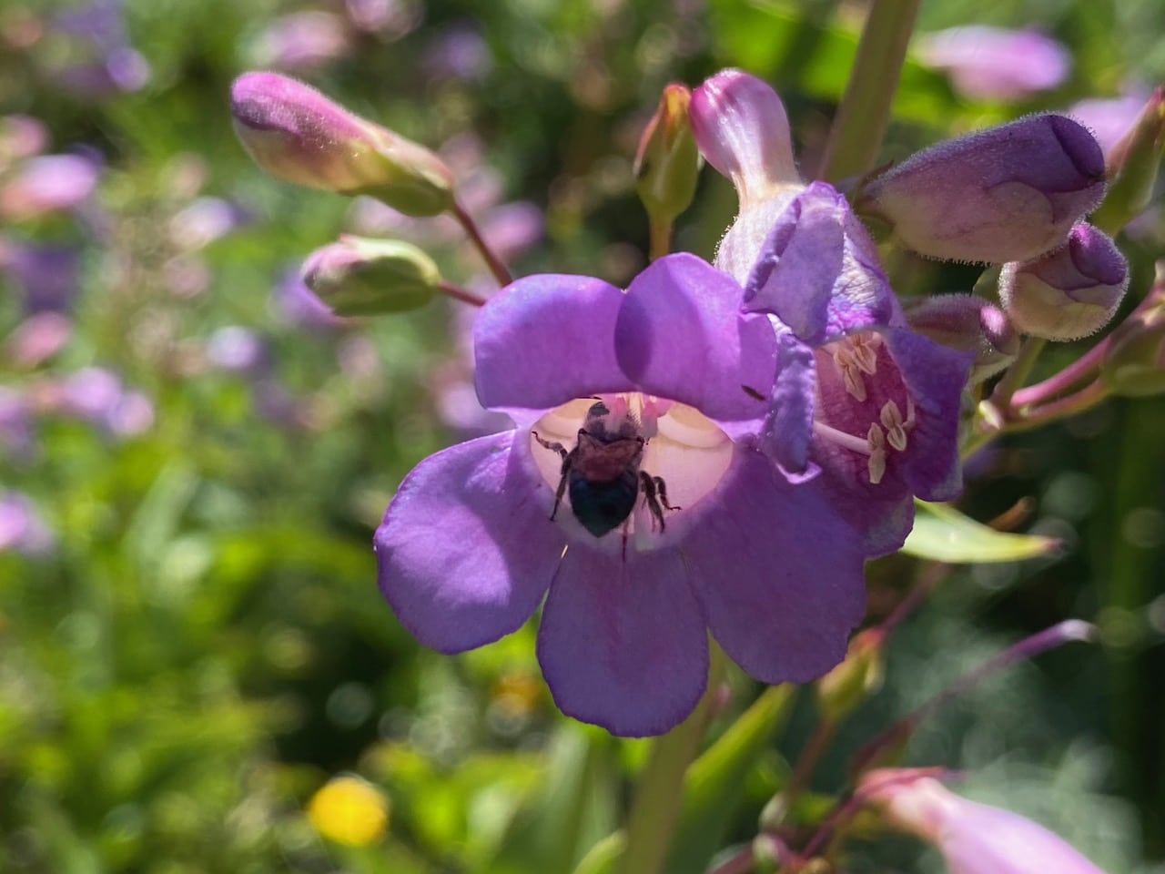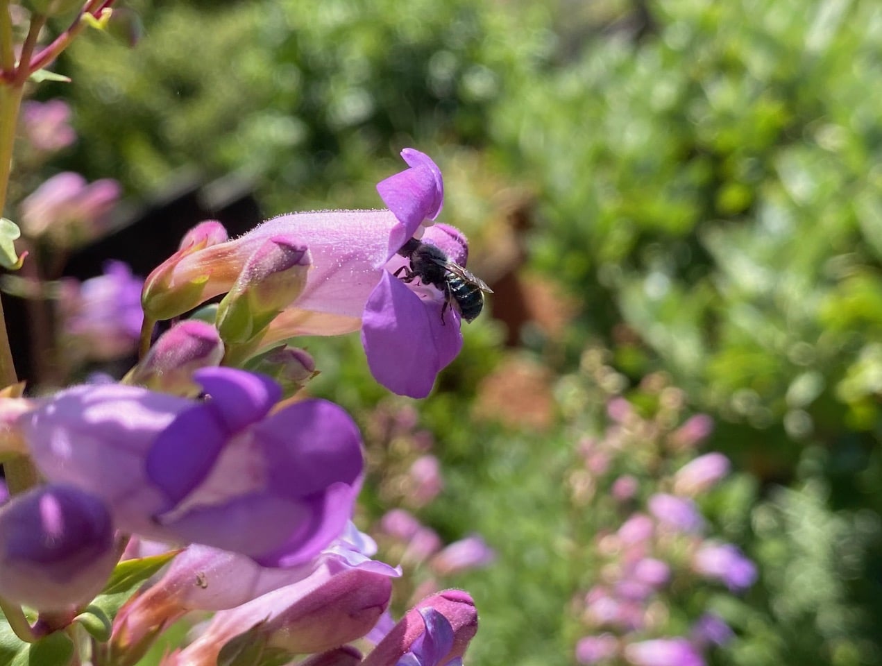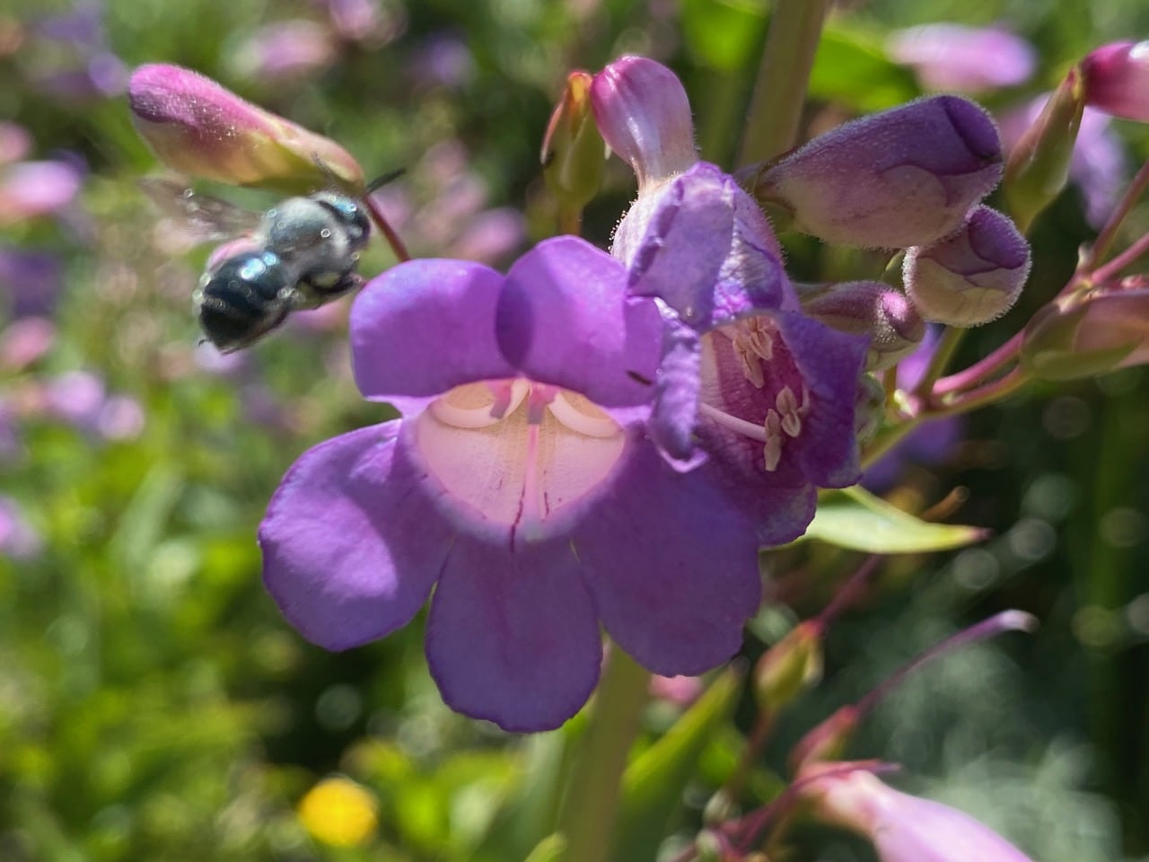 A Mason Bee, Osmia sp. (family Megachilidae) lands on the lower lip of a Penstemon flower.
