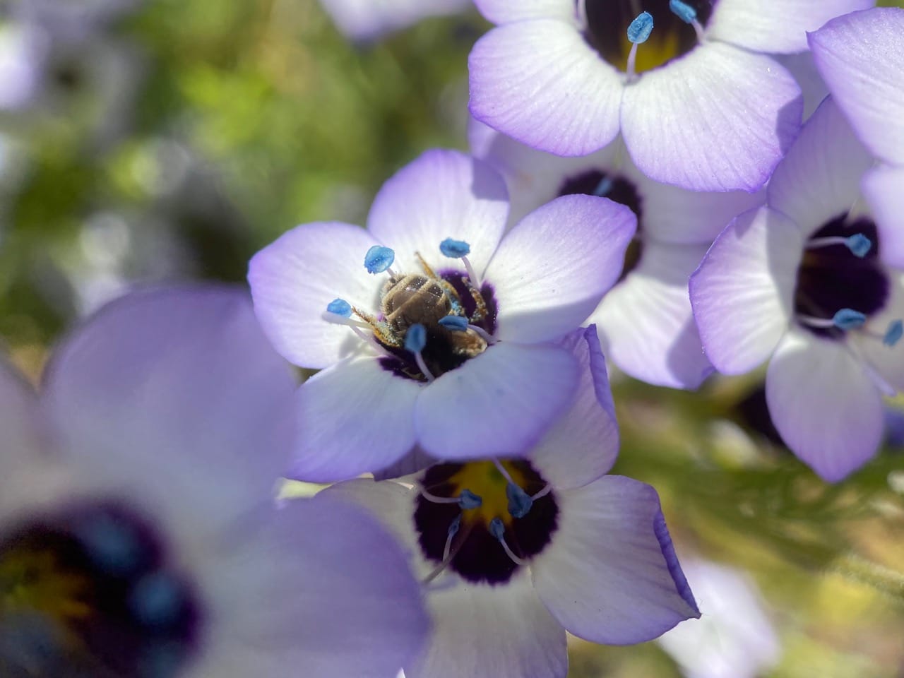 A small bee with black-and-white striped abdomen is entering the corolla of a Bird’s Eye Gilia, Gilia tricolor, seeking nectar at the base of the flower. Five stamens are held upright above the tubular base of the flower, offering powder-blue pollen.