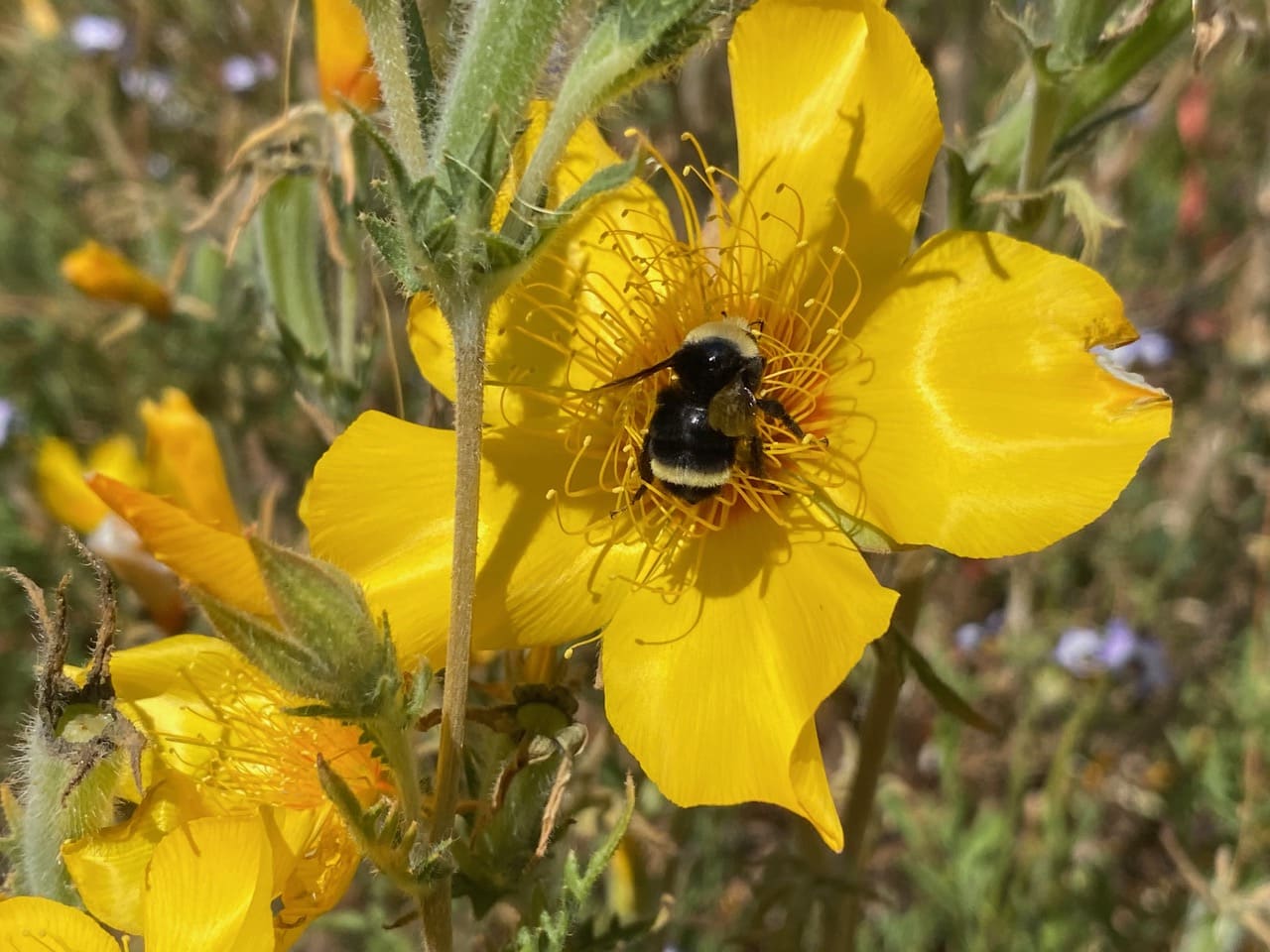 A Yellow-faced Bumble Bee, Bombus vosnesenskii (family Apidae) visits a flower of Lindley’s Blazingstar, Mentzelia lindleyi. The spectacular flower (up to 3 in. across) with a bright yellow, satin sheen is an annual wildflower in the Loasaceae family, found in the Coastal Ranges of California. Individual plants, about 1-2 feet tall, can produce many flowers which open in the afternoon. The flowers seem to be popular with the insect pollinators.