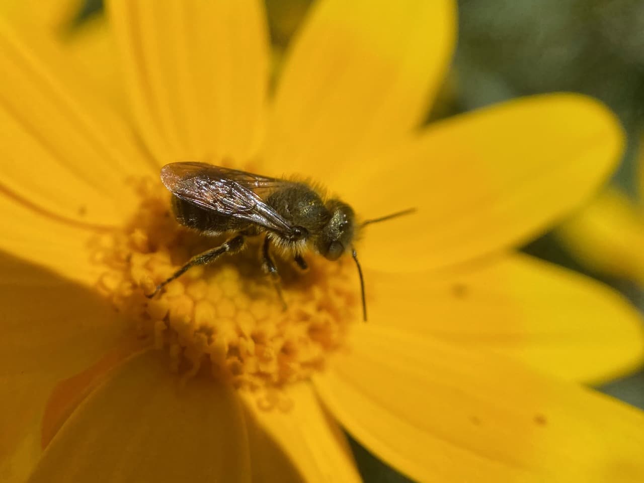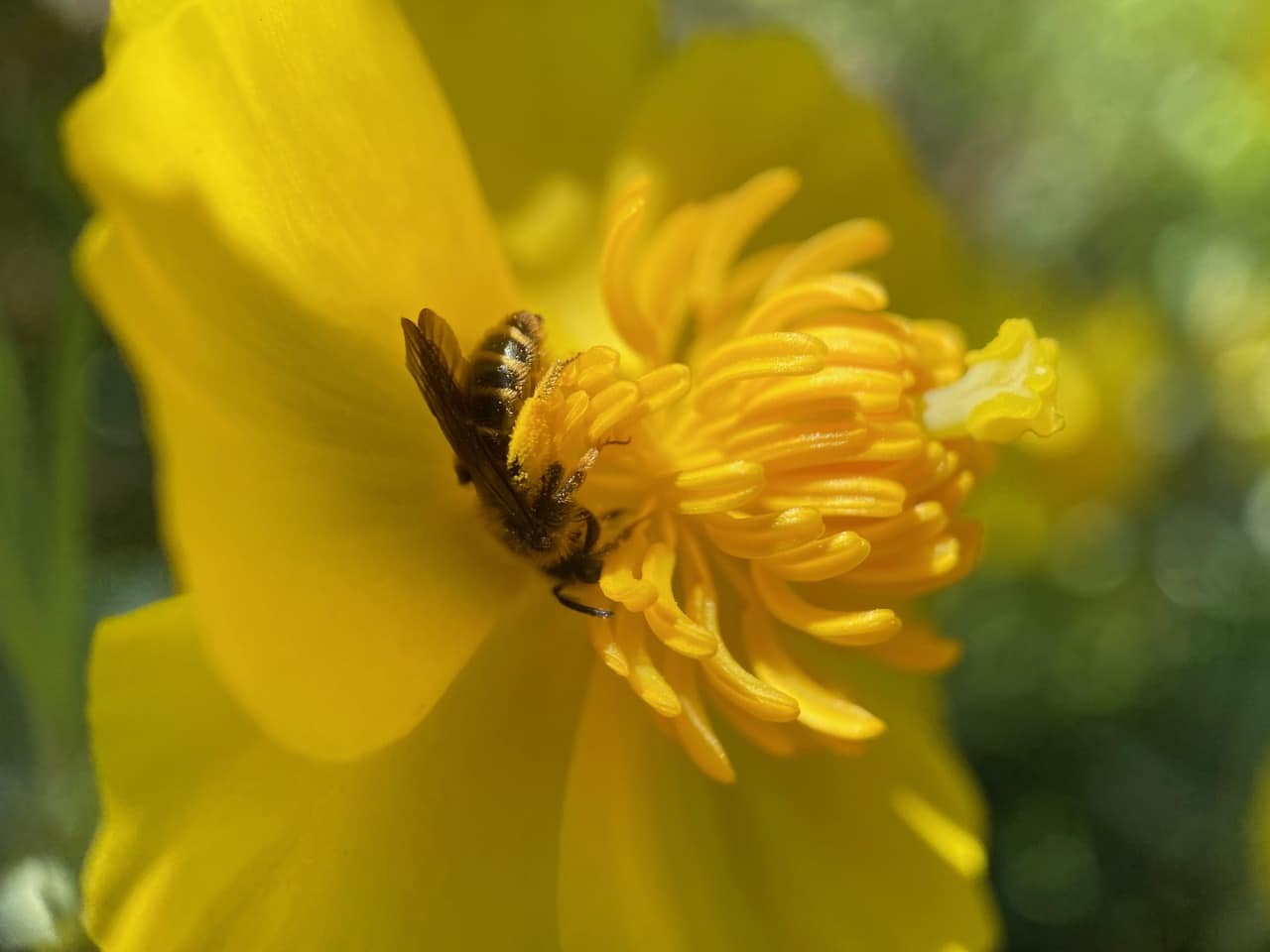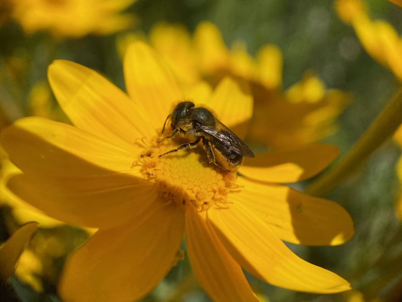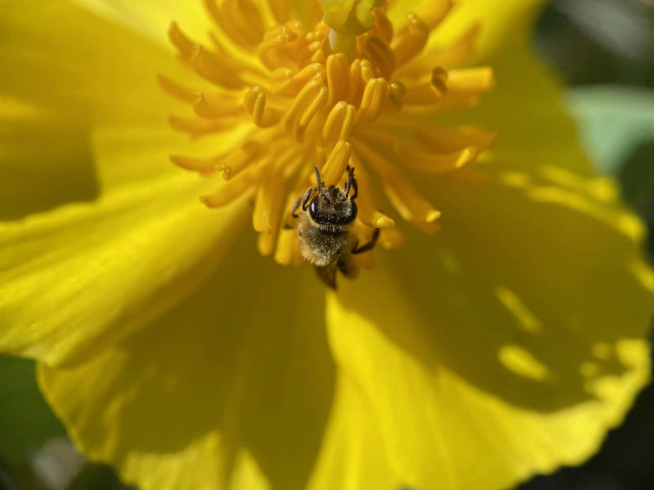A Golden-haired Miner Bee, Andrena auricoma (family Andrenidae) lands on the stamens of a Bush Poppy, Dendromecon rigida. As with other poppies, the flowers of Bush Poppy do not produce nectar.