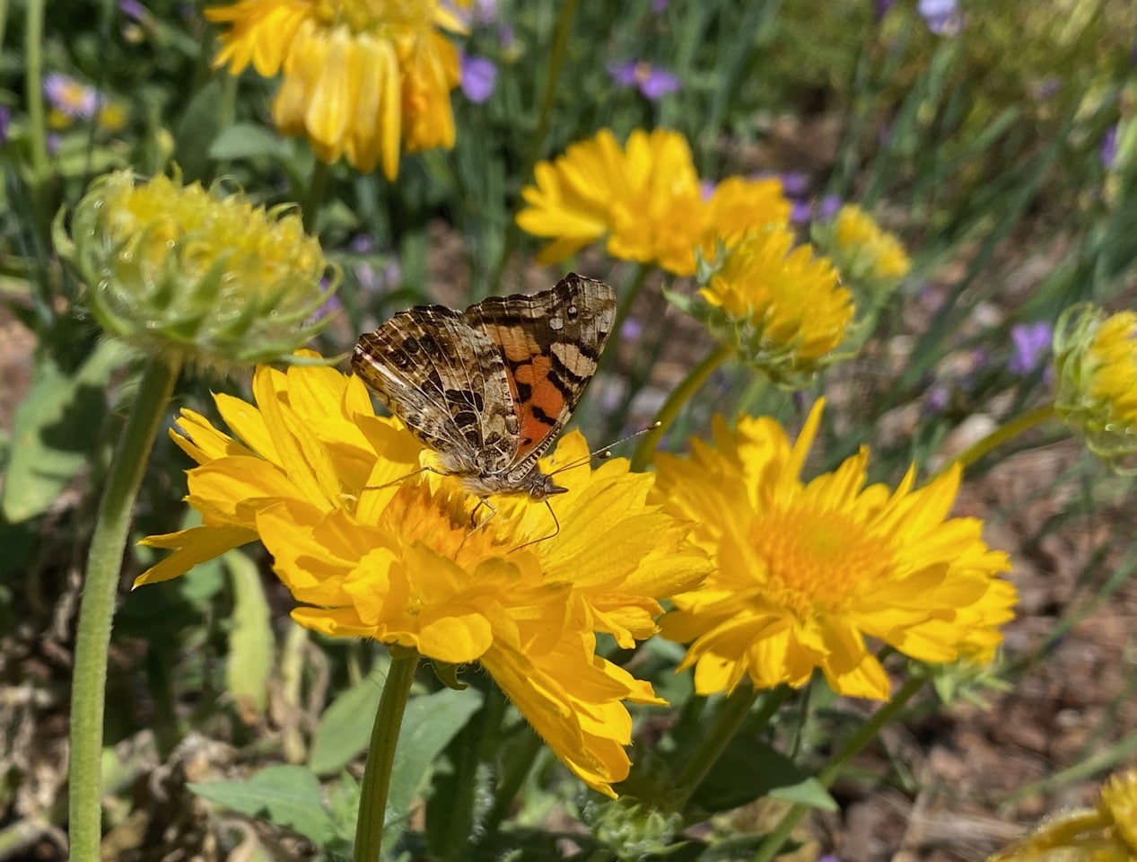 A West Coast Lady, Vanessa annabella (family Nymphalidae) is taking nectar from a low-growing yellow flower I don’t recognize. The owner of the garden explains apologetically that the plant is Gaillardia or Blanket Flowers. It is not native but she has kept it around because it has a long bloom time, and appears to be nectar favorites among the pollinators. The butterfly is grateful for her judicious decision.
