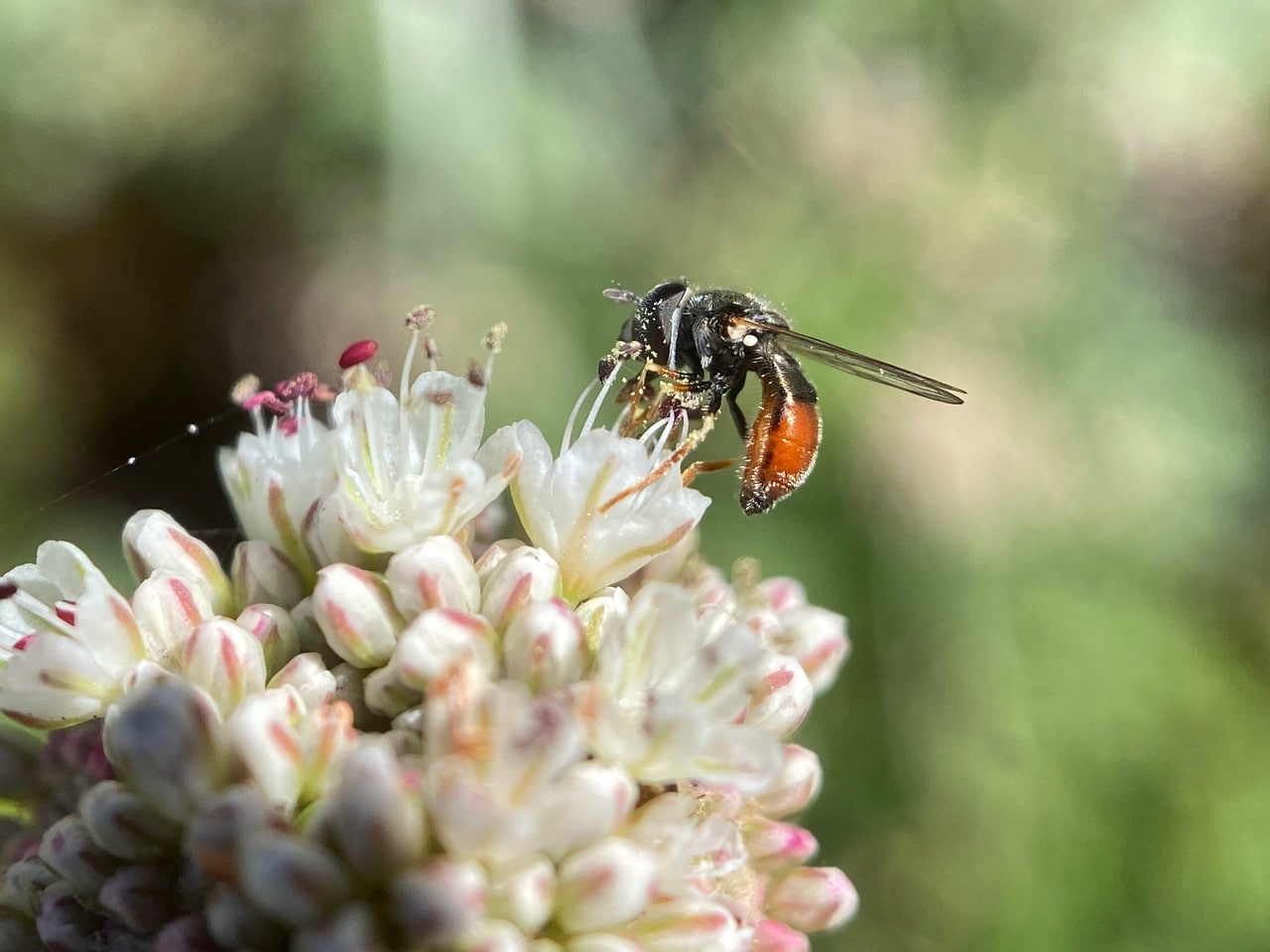 A tiny hoverfly, the Common Grass Skimmer, Paragus haemorrhous (family Syrphidae) is taking nectar from a flower of Naked Buckwheat, Eriogonum nudum.