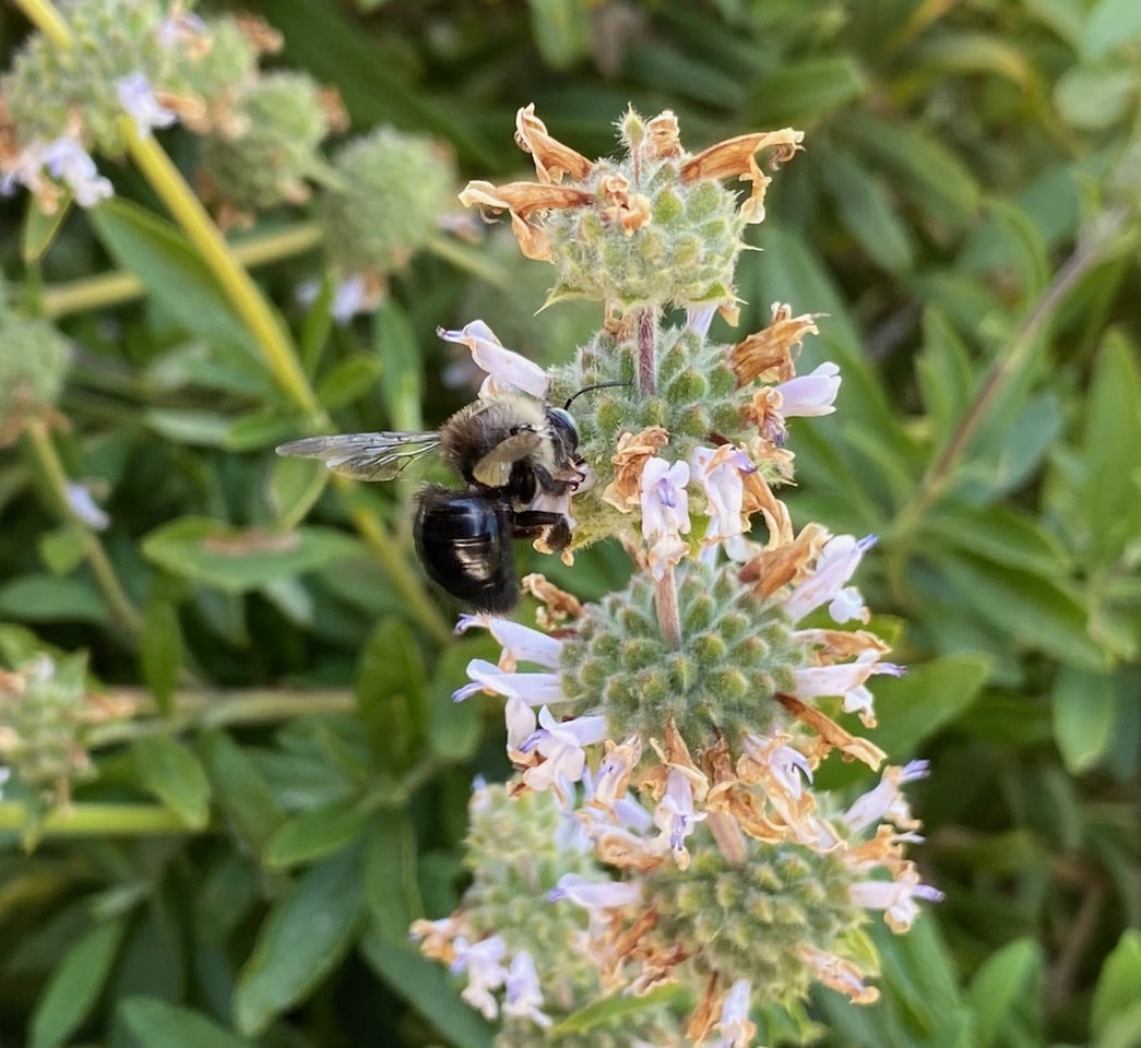 A male Horse-fly Carpenter Bee, Xylocopa tabaniformis (family Apidae) is taking nectar from the flowers of Black Sage.
