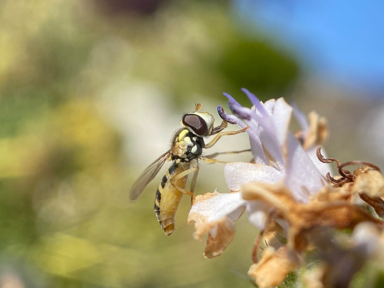 Hover Flies, also called Syrphid Flies make up the insect family Syrphidae. They are often seen hovering or nectaring at flowers; the adults of many species feed mainly on nectar and pollen, while the larvae eat a wide range of foods. In many species, the larvae feed on aphids, thrips, and other plant-sucking insects. In some species, the larvae are saprotrophs, eating decaying plant and animal matter in the soil or in ponds and streams. Many Hover Flies are brightly colored, with spots, stripes and bands of yellow; due to this coloring, they are often mistaken for wasps or bees. They exhibit Batesian mimicry – the resemblance to stinging insects gives the hover flies some protection from predators.