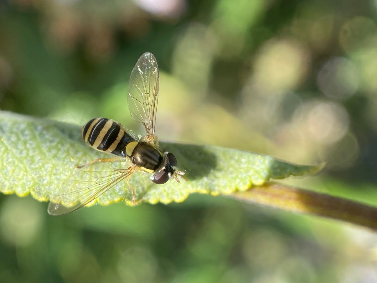 A small hover fly (family Syrphidae) lands on a leaf of Black Sage, Salvia mellifera. It is a female as its eyes do not meet on top of the head. Males have holoptic eyes that meet along a central line on top of their head. This is a useful feature for distinguishing the sexes of hover flies.