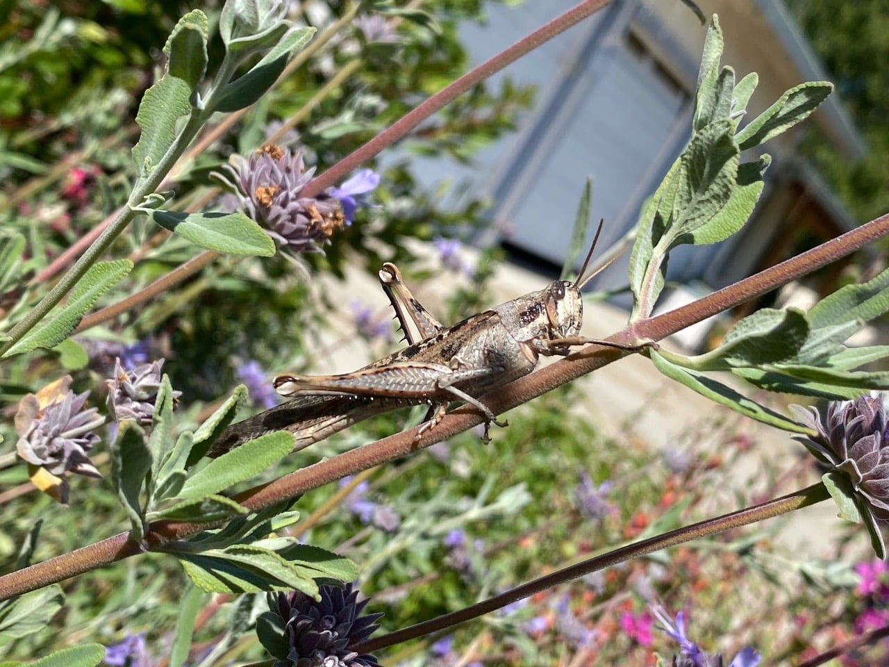 Wow, that is the largest grasshopper I have ever seen, about 3” long! It is perched on the stem of a Black Sage. iNaturalist has identified it as the Gray Bird Grasshopper, Schistocerca nitens (family Acrididae).