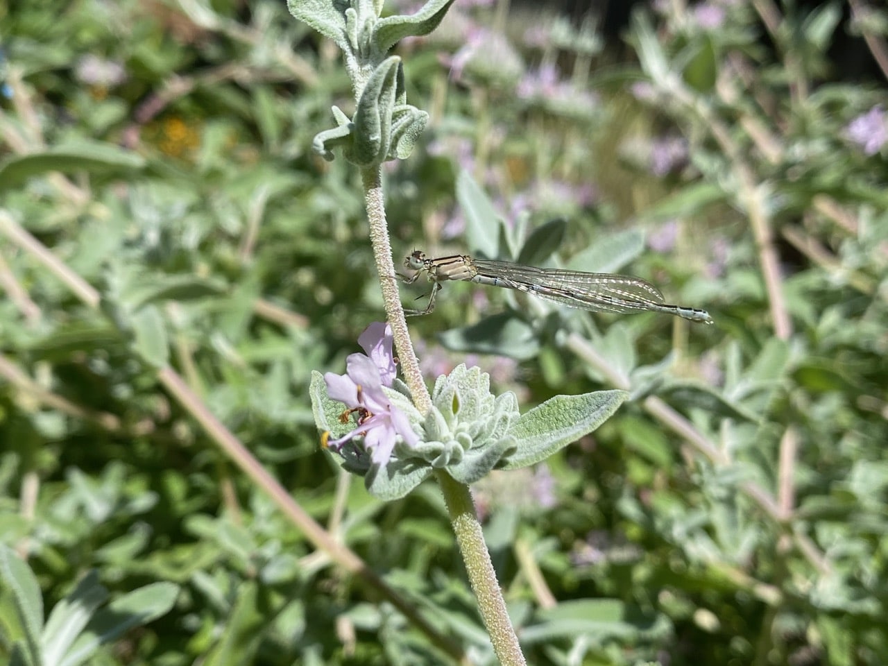 A pale blue-green Bluet Damselfly (genus Enallagma) blends in almost imperceptibly among the foliage of the Black Sage. It is probably a teneral that has yet to acquire its full color. A teneral insect is one that has recently eclosed or molted and is yet to harden and get its final coloration. Teneral insects may be mobile and may even fly but can often be identified due to their pale coloration.