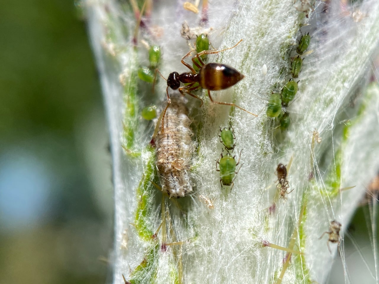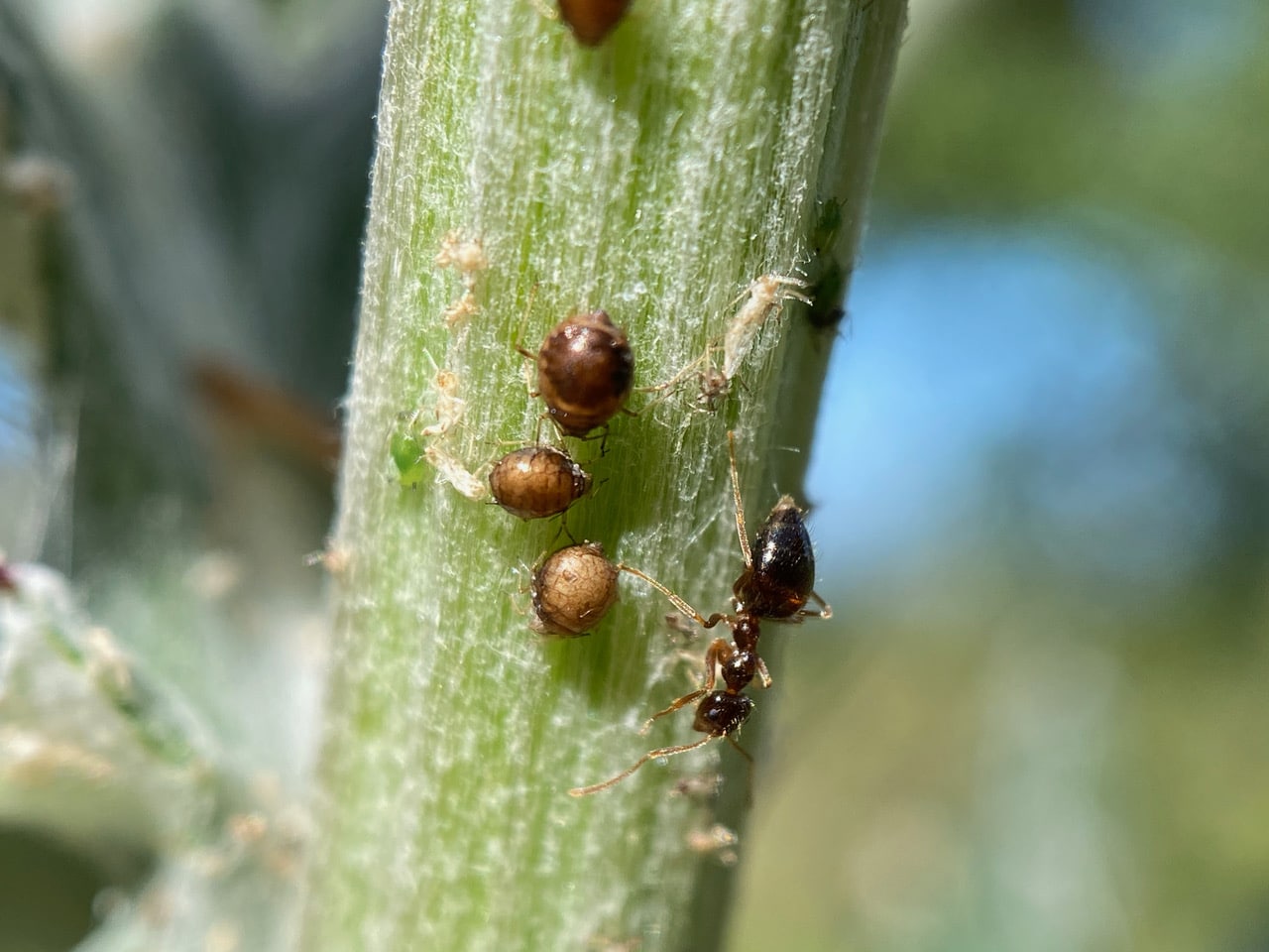 There are aphid mummies everywhere. I watch with bated breath for the ants’ reaction to the parasitized aphids. Several ants walk past this group of mummies, sometimes stopping to check them out, but all eventually lose interest and go away. Do the ants not sense that there’s danger lurking in the aphid mummies? Surely these mummies are no longer able to produce the honeydew that the ants crave? Are the parasitoid wasps inside the aphid mummies actually immune from the attacks of the attending ants?