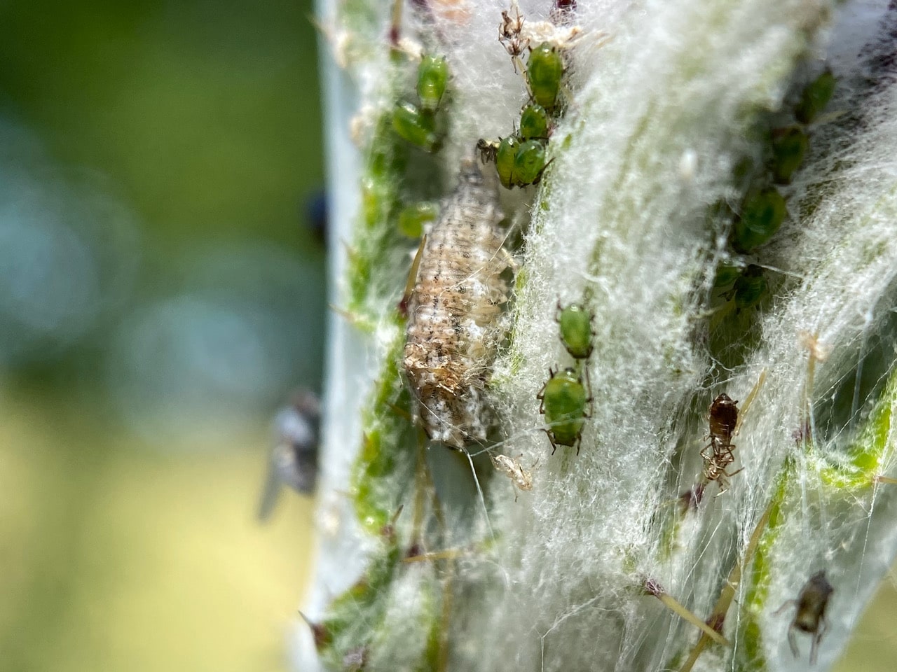 Here’s another case in point. A brown Syrphid larva ( Eupeodes sp.?) is lying amid young aphids. The blunt end is its rear end. At the other end, the larva is feeding on an aphid.