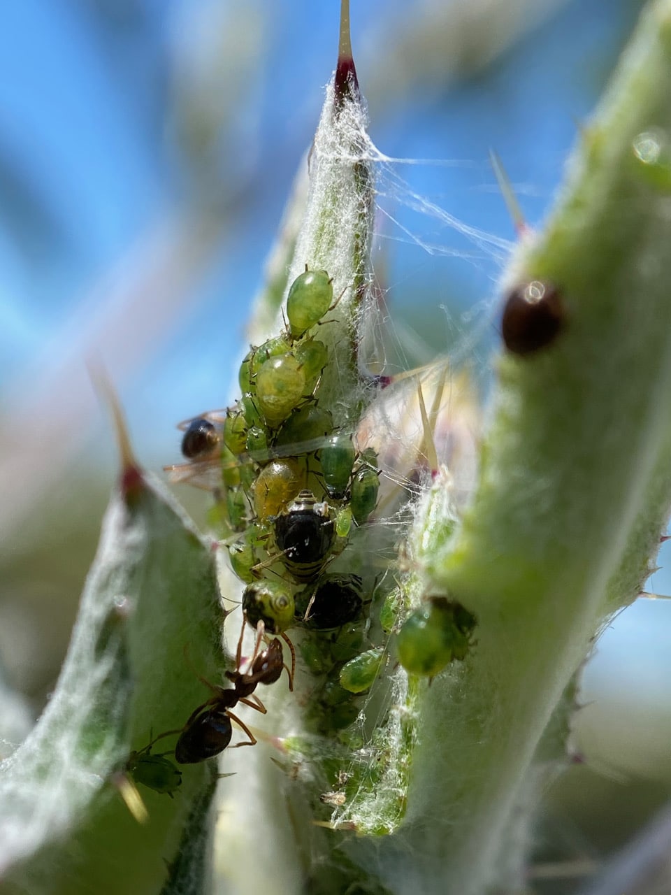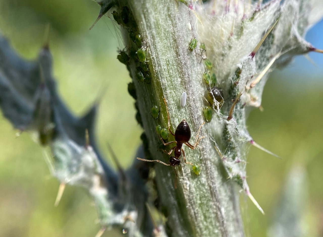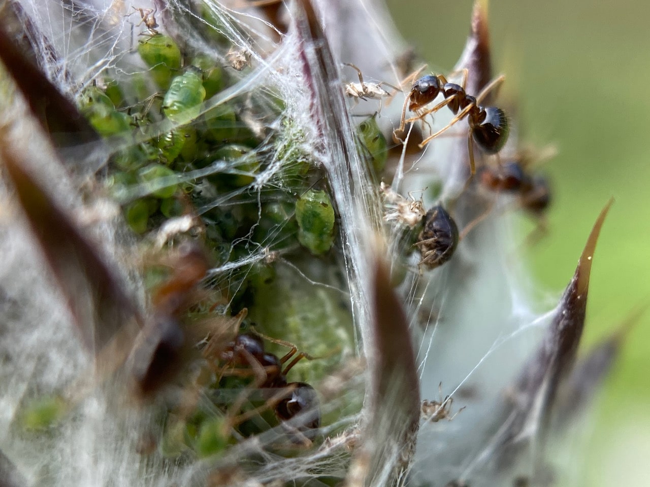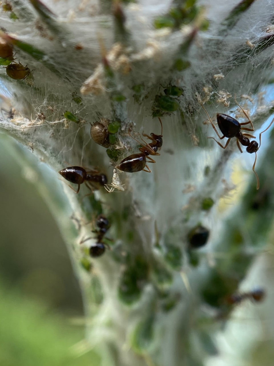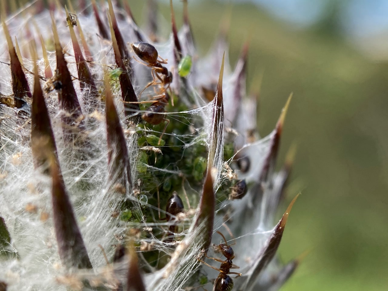 The underside of this thistle flowerhead is a metropolis of aphid and ant activity.