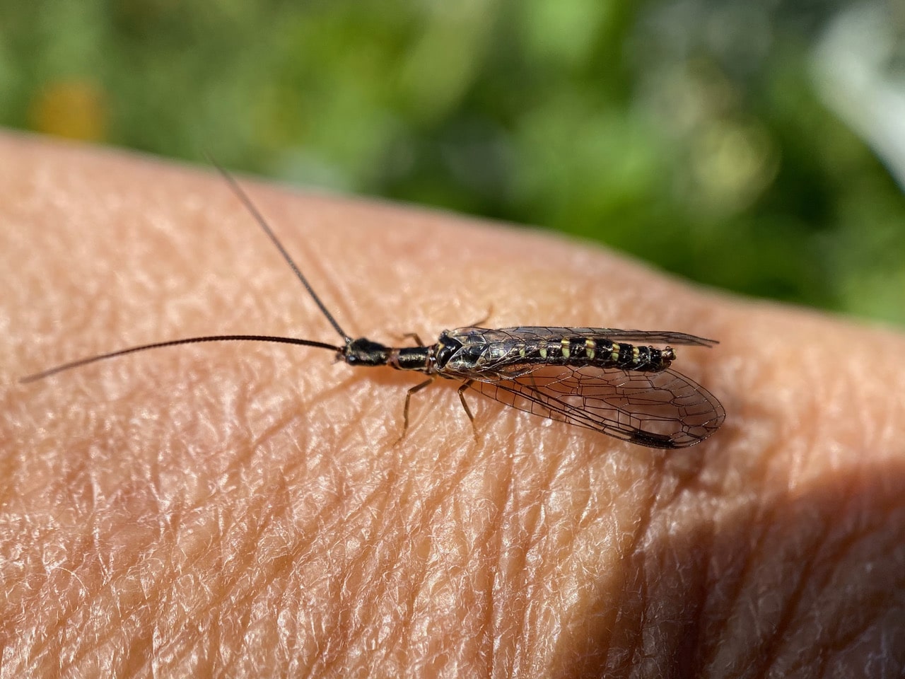 The Snakefly comes to rest on my hand, its wings drooping in misery. Will it survive the injury? The tip of the insect’s abdomen is oozing tiny drops of liquid – it’s probably where the ant has bitten it.