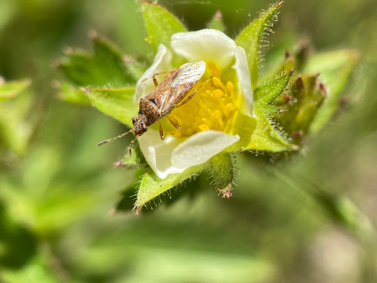 Here’s a bug that is commonly seen on the Sticky Cinquefoil flower, Drymocallis glandulosa. It is a member of the genus Arhyssus, the Scentless Plant Bugs (family Rhopalidae). Little information is available about these bugs, except that they lack well-developed scent glands, and that they feed on seeds of herbaceous plants.