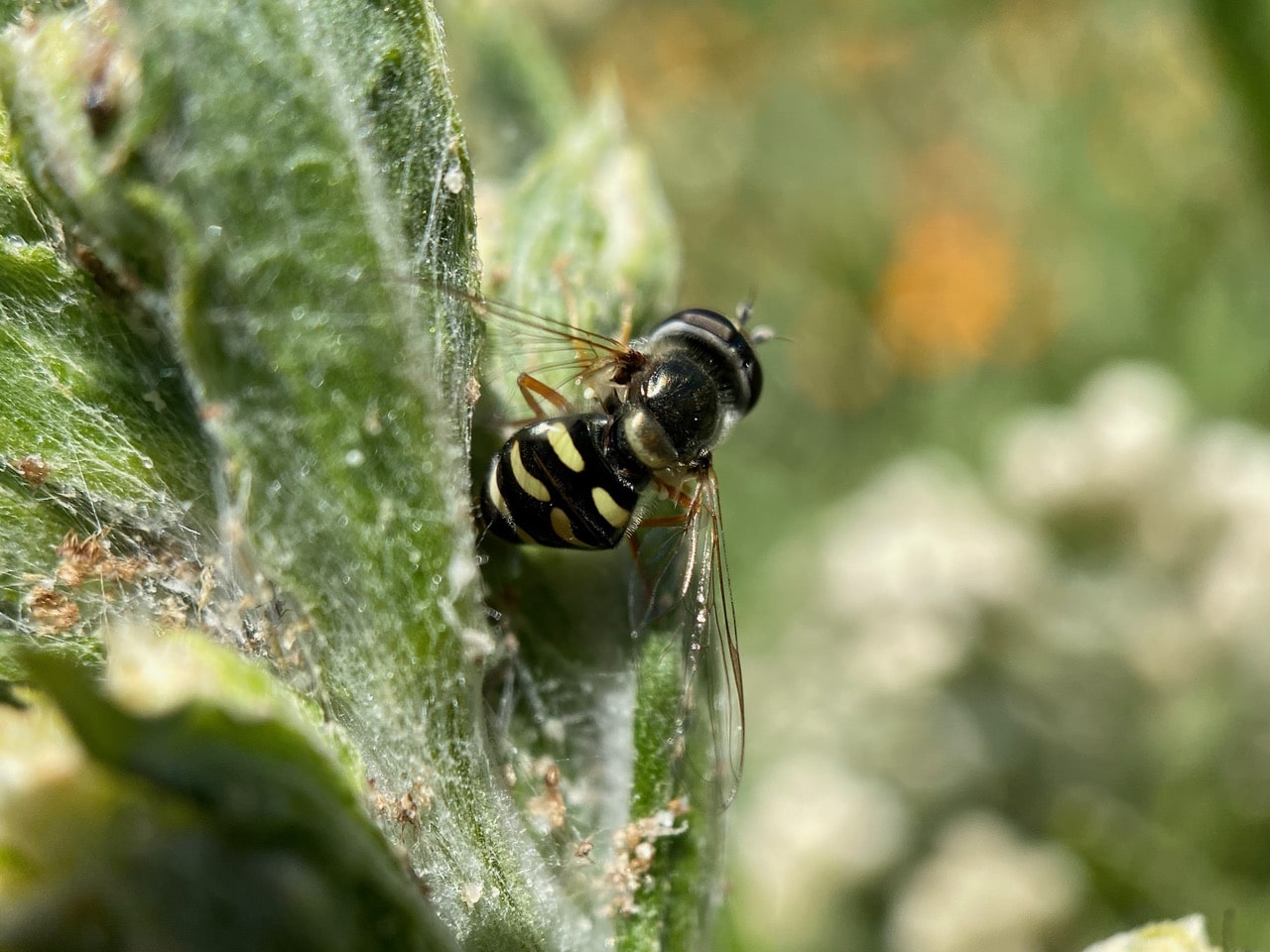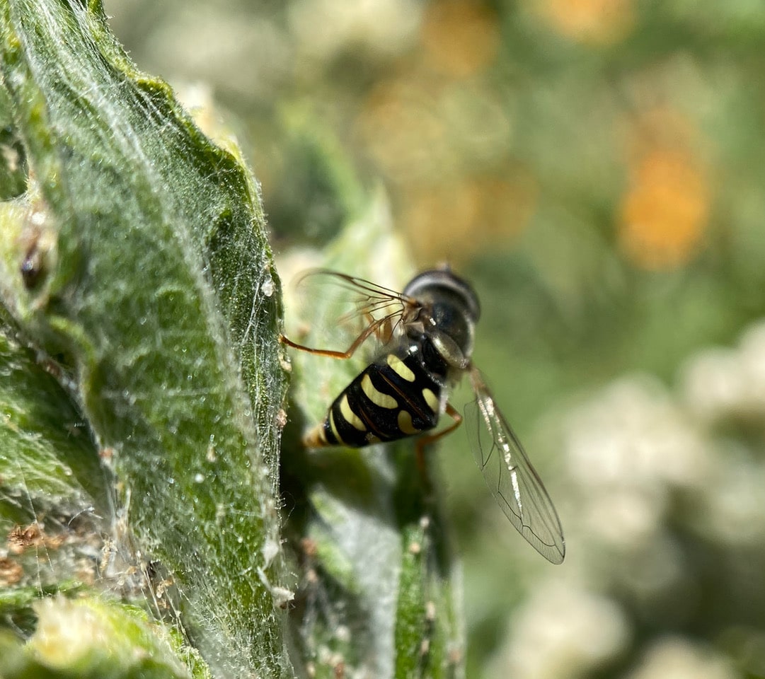 Here’s another sign that the plant is infested with aphids – a female Large-tailed Aphideater, Eupeodes volucris (family Syrphidae) is laying eggs on it! The larvae of this hoverfly species feed on aphids; females seek out aphid colonies in which to lay eggs. After flying around the tips of the plant several times, the female finally lands with the tip of her abdomen extruded, ready to oviposit. Note the aphid debris and waxy droplets on the plant.