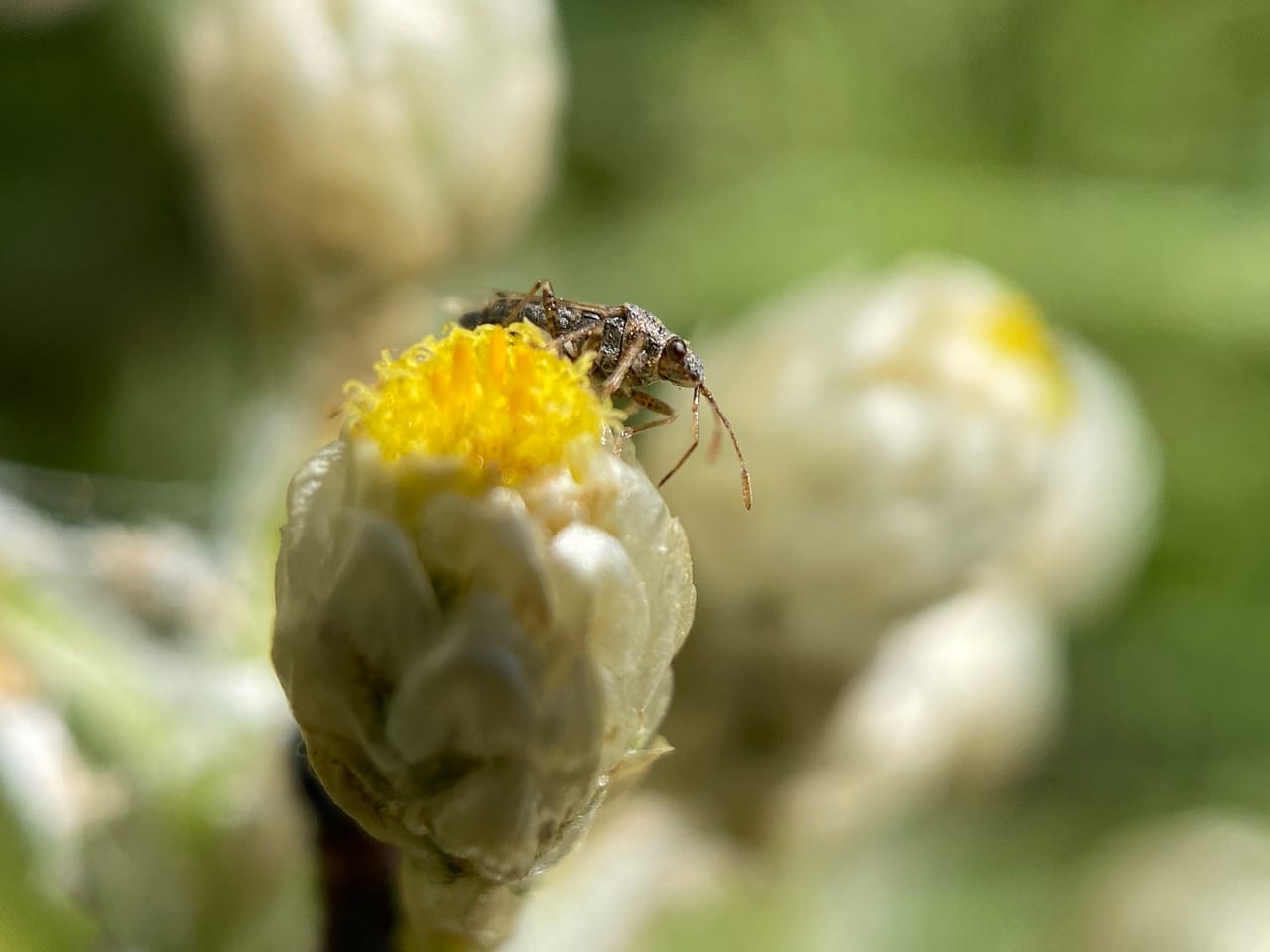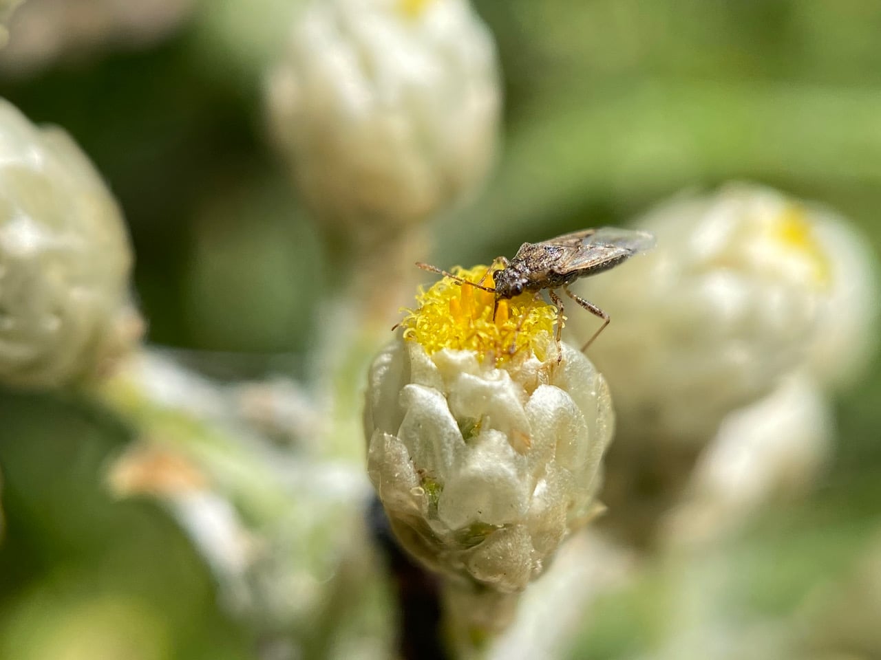With its proboscis sunk into the open flowerhead of a California Everlasting, a False Cinch Bug, Nysius raphanus (family Lygaeidae, order Hemiptera) is feeding with its piercing-sucking mouthparts.