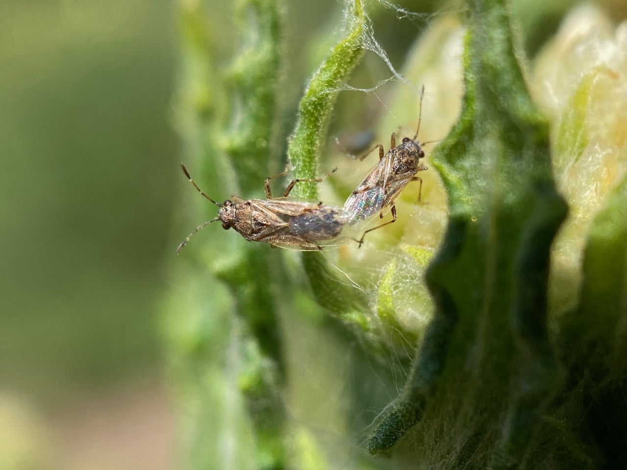 A pair of False Cinch Bugs, Nysius sp. (family Lygaeidae) is mating among the immature flowerheads of California Everlasting. Note the proboscis that is folded under the body when not in use.