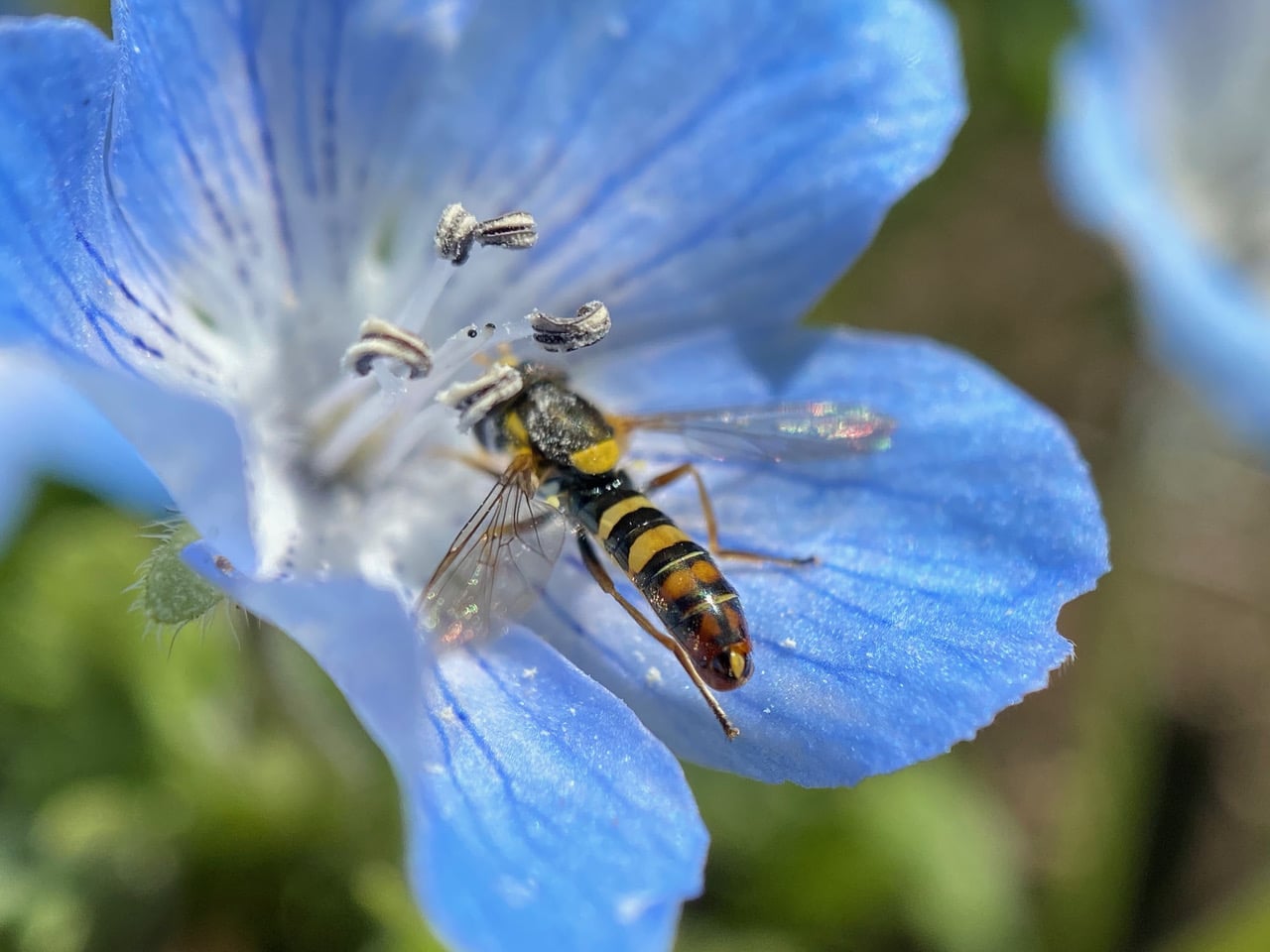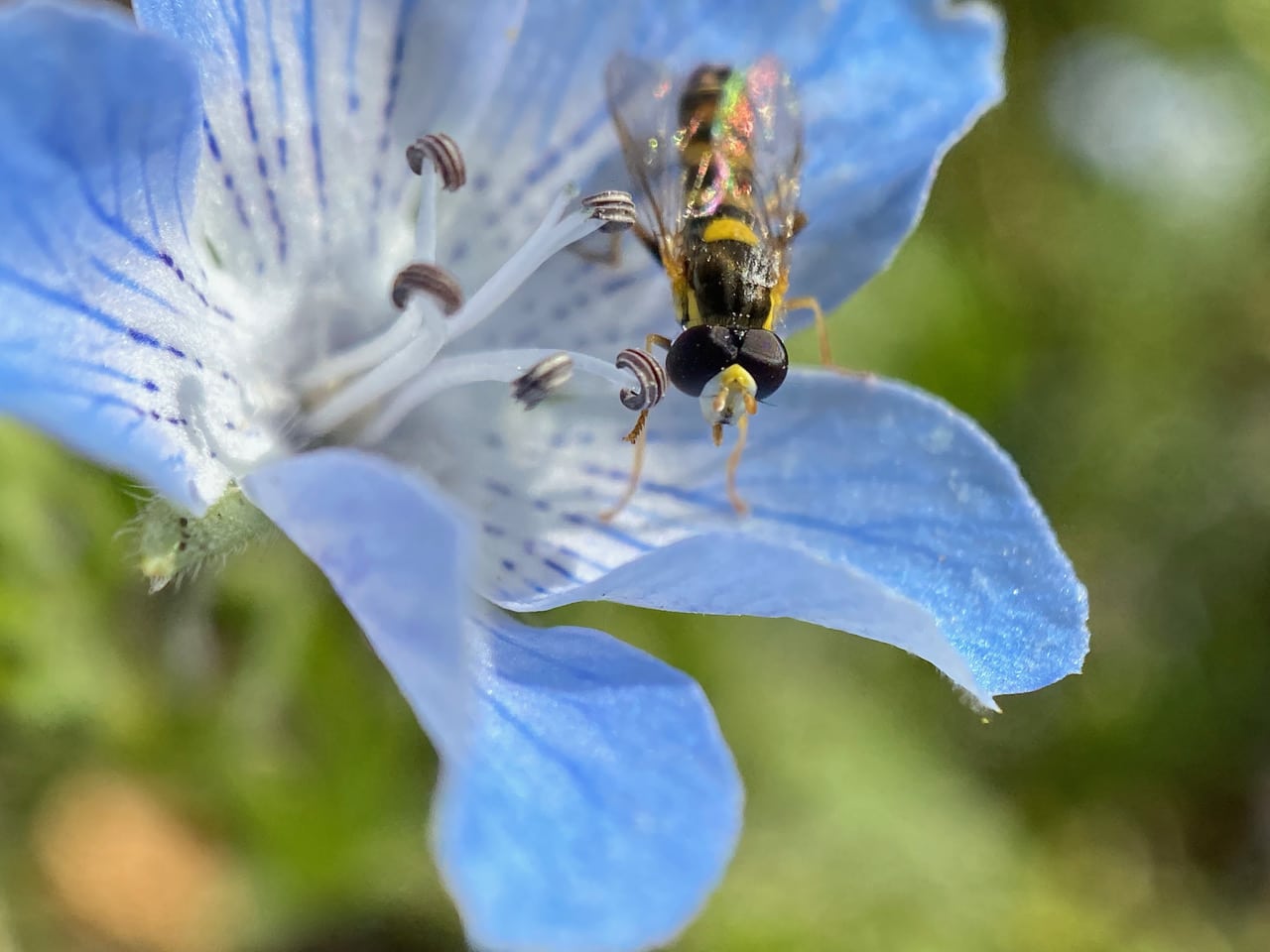 A male Globetail Hoverfly, Sphaerophoria sp. (family Syrphidae) is foraging on a Baby Blue Eyes flower, Nemophila Menziesii. Note his large, holoptic eyes that meet in a central line on top of his head. Females have eyes set apart. This gender difference is commonly seen in Syrphidae.