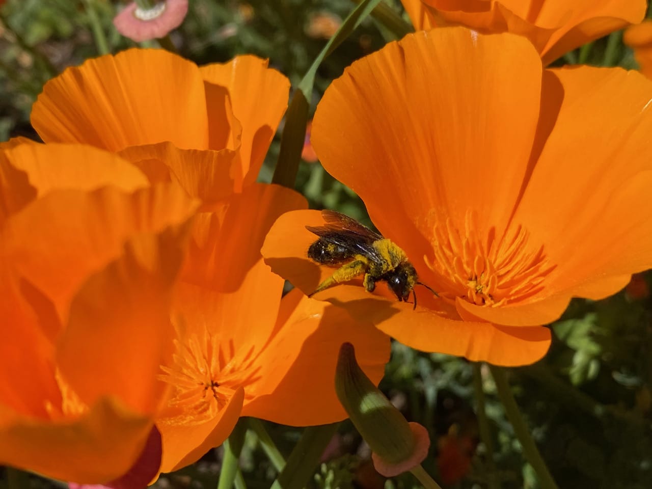 The patch of California Poppy is so dense that a bee could easily walk from one flower to the next. Covered with pollen, a Mining Bee, Andrena sp. (family Andrenidae) is taking her sweet time foraging. Note that her scopa (special pollen collecting hairs) extends all the way to the upper part of her hind leg, seemingly to her “arm pit”. This is characteristic of the genus Andrena.