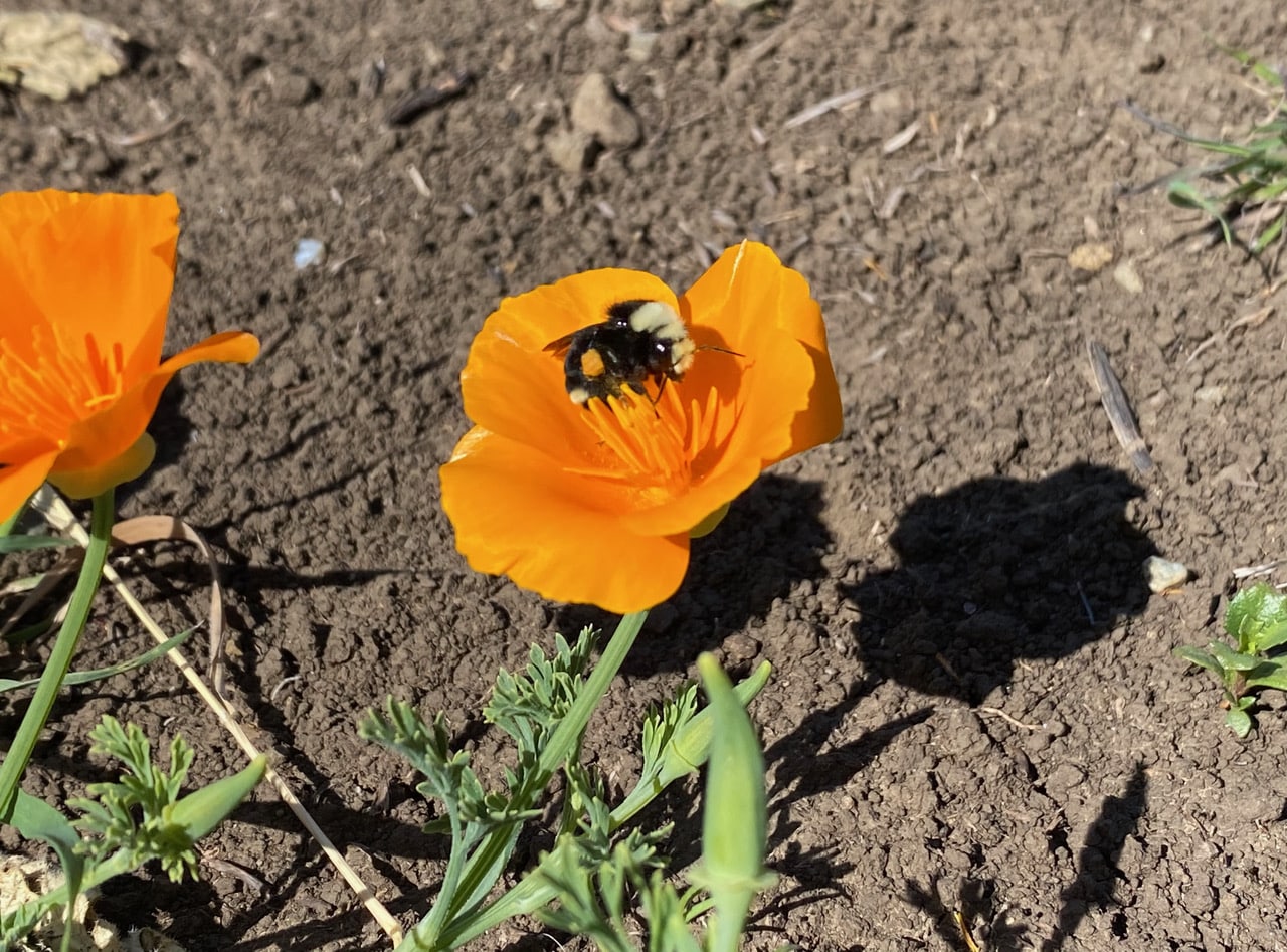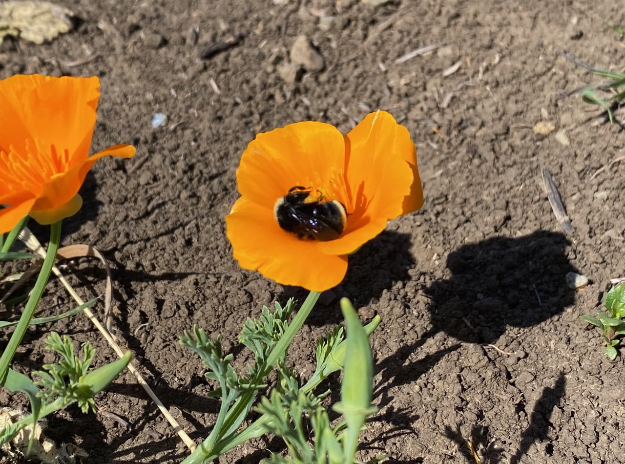 A Yellow-faced Bumble Bee, Bombus vosnesenskii drops in on a California Poppy, Eschscholzia californica.