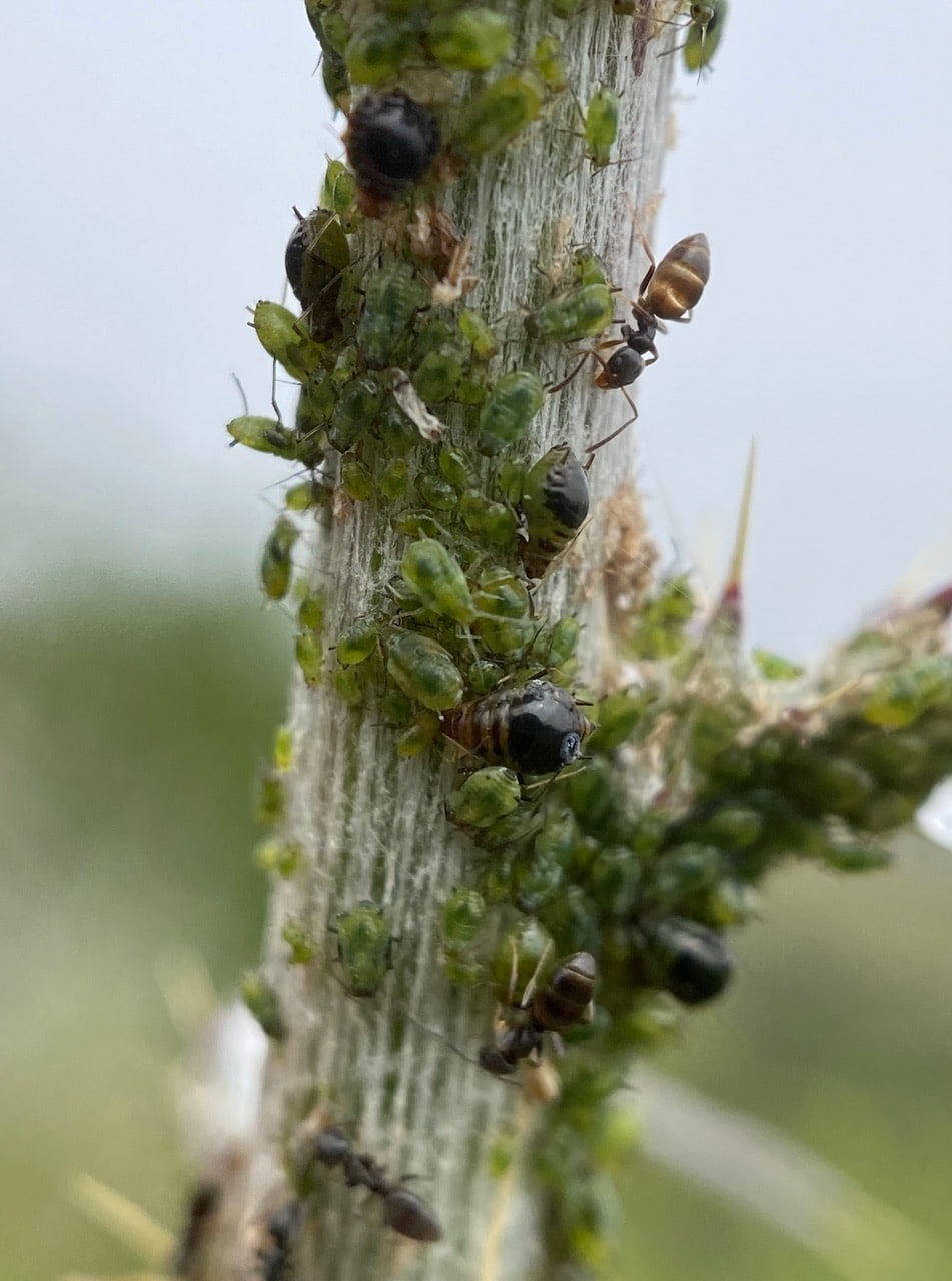 Wow, a whole row of aphid “mummies” on another stem of Cobweb Thistle. The one on top already has a gaping hole on its rear from which the parasitoid wasp has emerged.