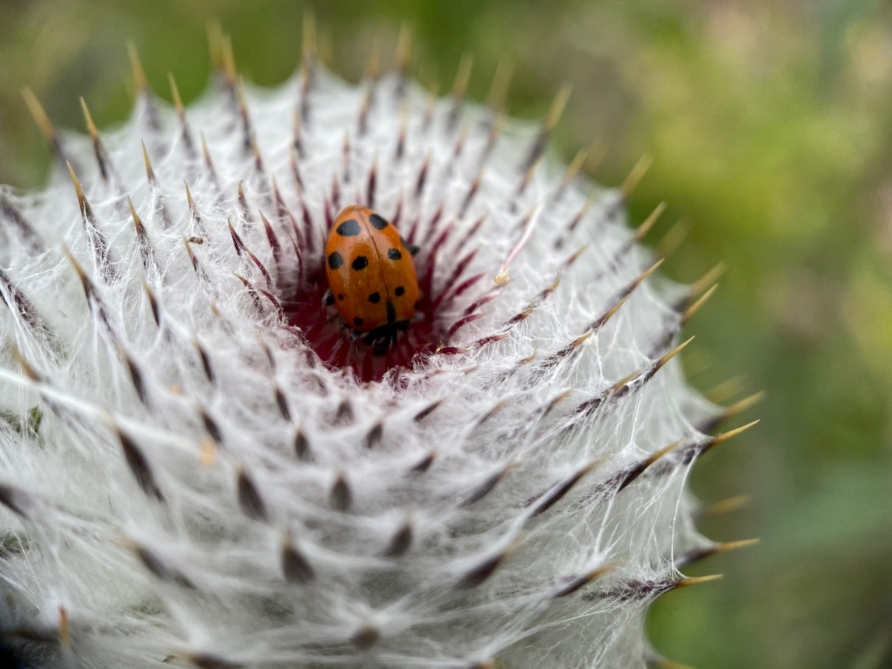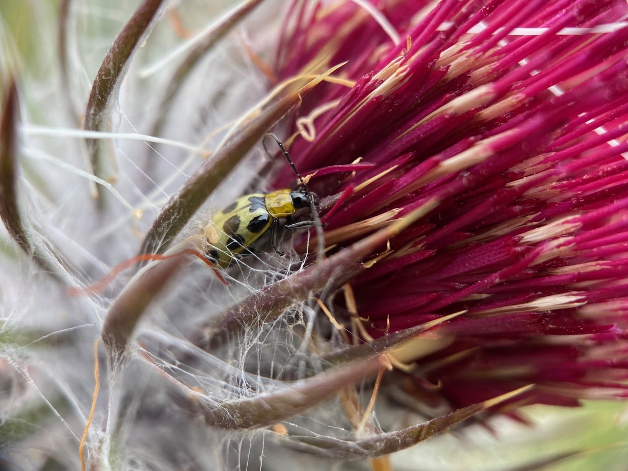 A Ladybeetle is reaching deep into the center of an immature flowerhead of Cobweb Thistle where most aphids often thrive.