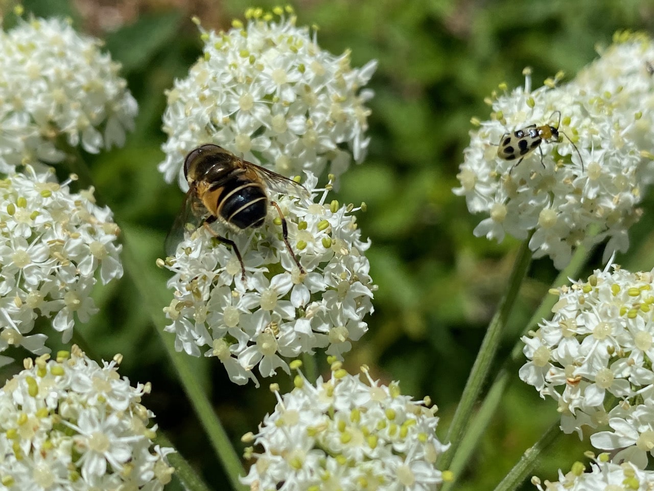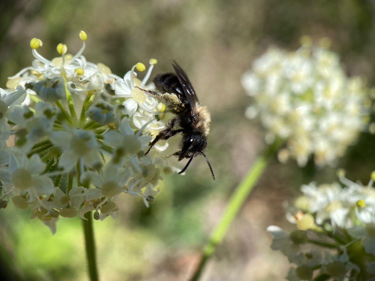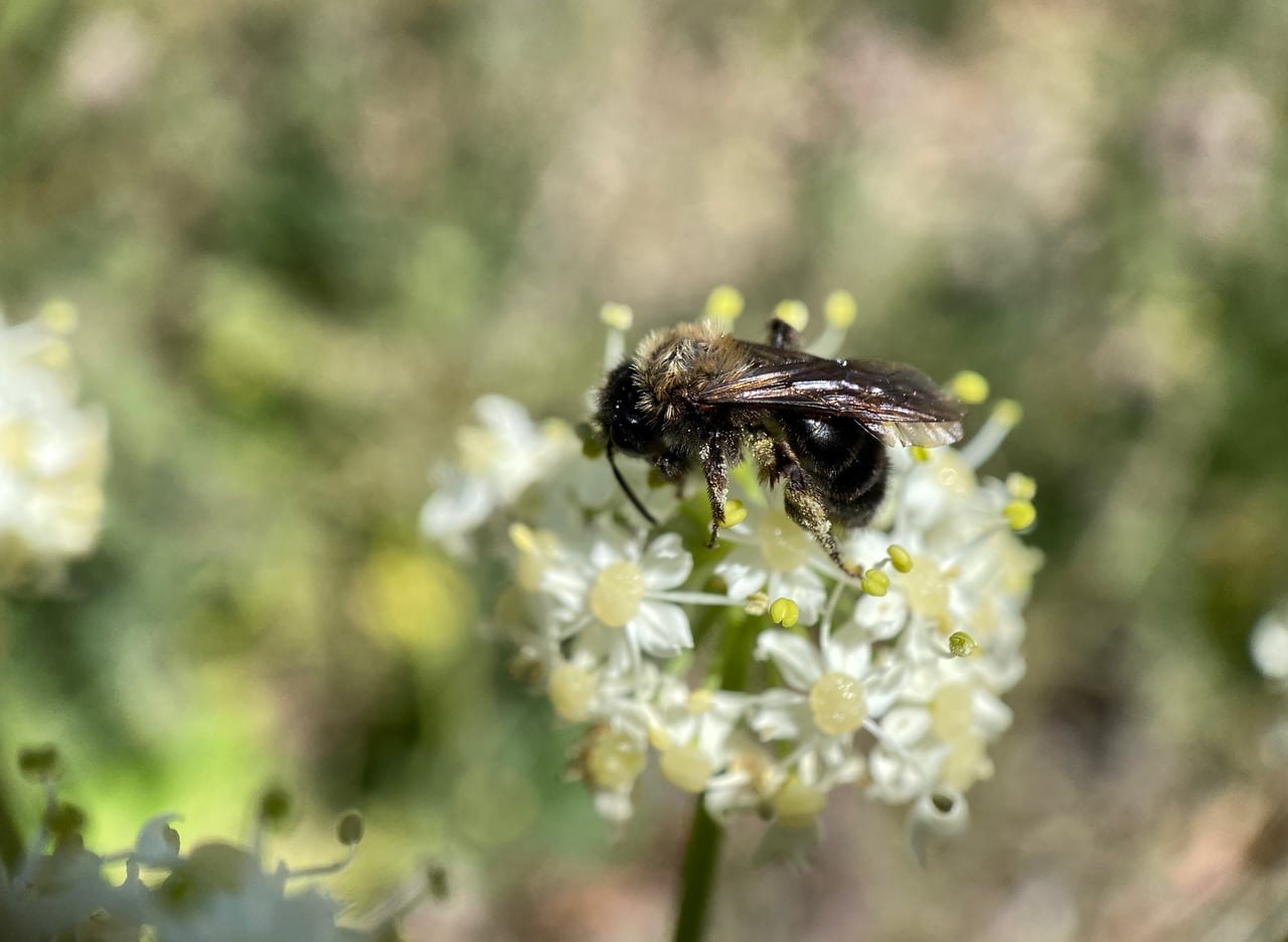 A tired, disheveled little bee is seeking nectar from Cow Parsnip flowers. Some pollen on her scopae seem to have fallen off.