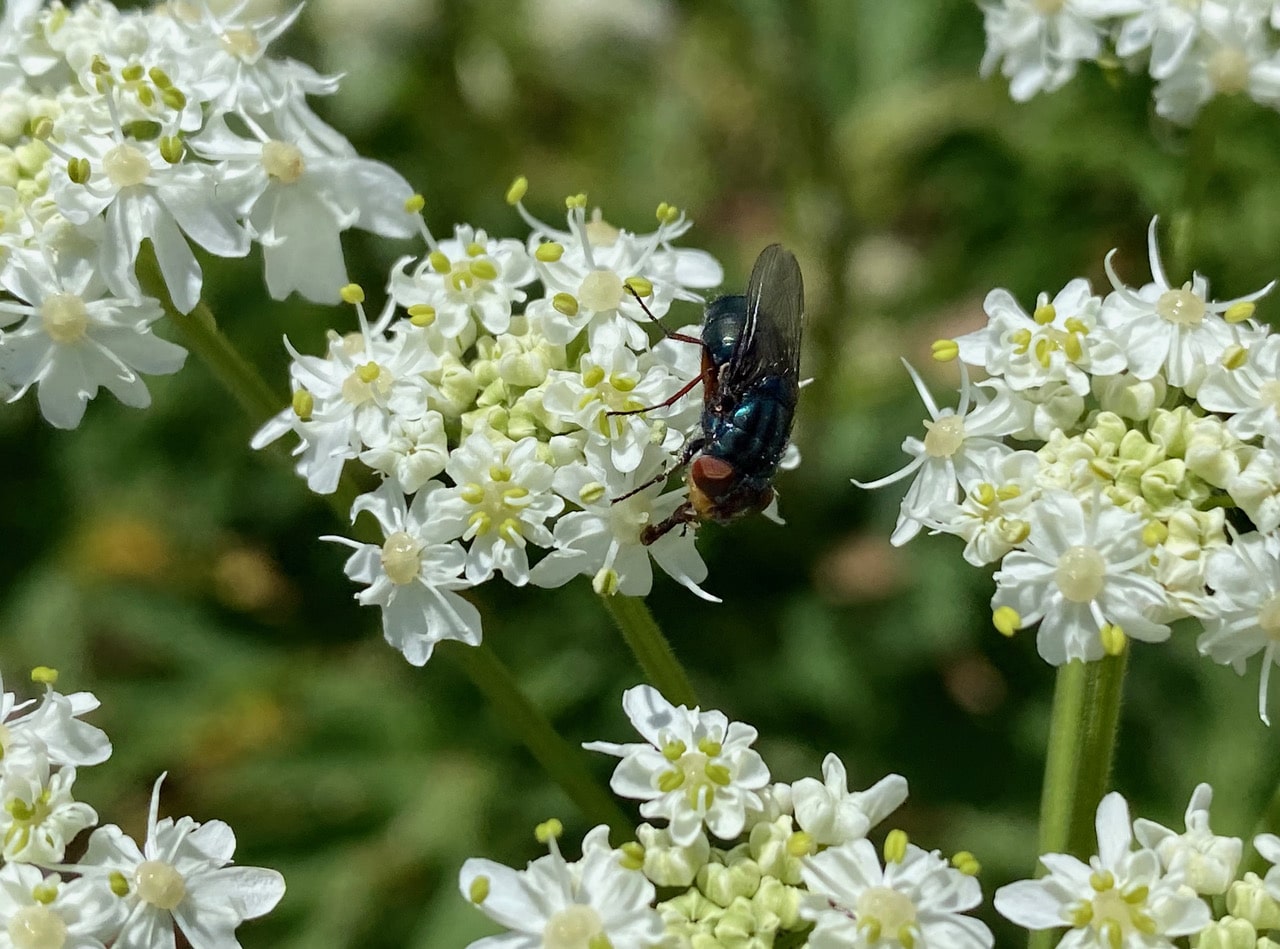 Its sponging mouthpart extended, a Secondary Screwworm Fly, Cochliomyia macellaria (family Calliphoridae) is taking nectar from a Cow Parsnip flower.