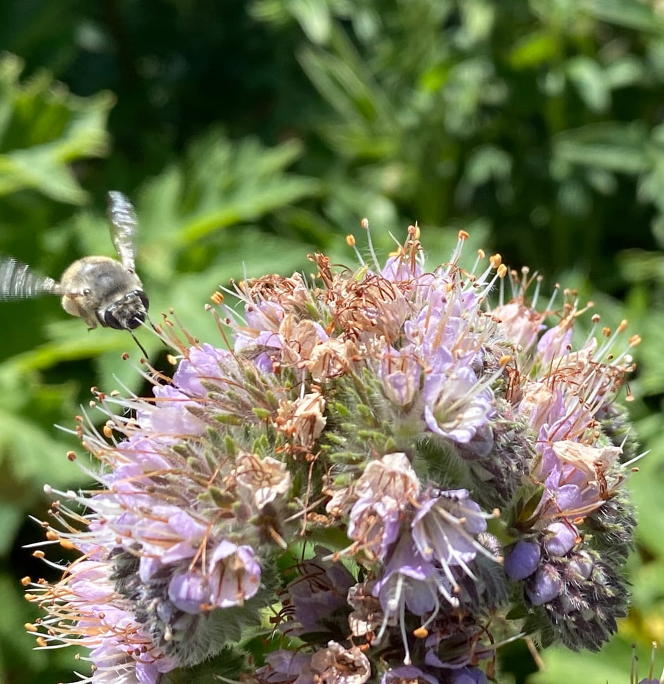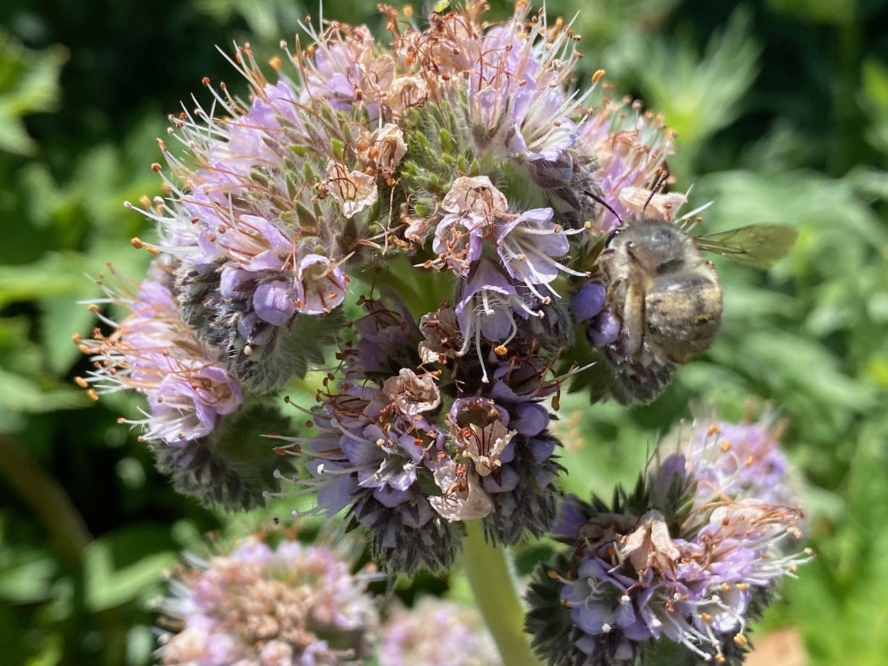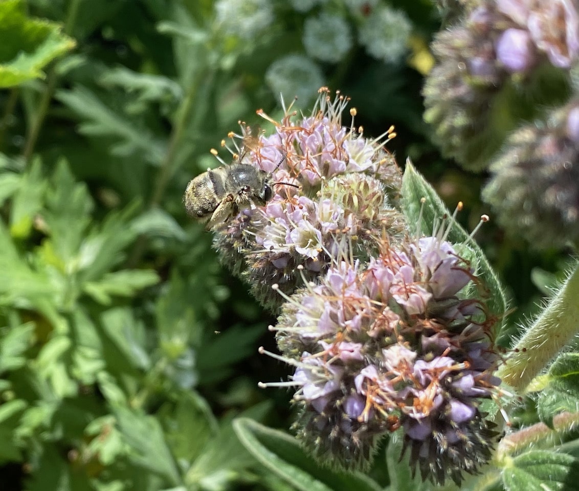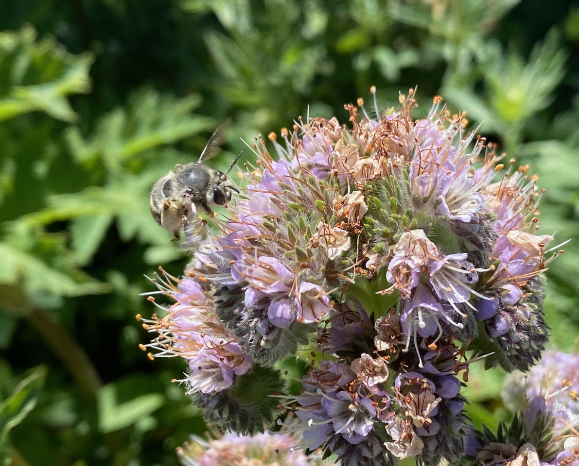 Hey, there’s a new bee in the garden! Fast and furious, it buzzes around the inflorescences of California Phacelia, Phacelia californica. Built like a bumble bee, it is chuncky, but is a plain gray-brown all over. It is a female, as she is carrying pollen on the scopae of her hind legs.