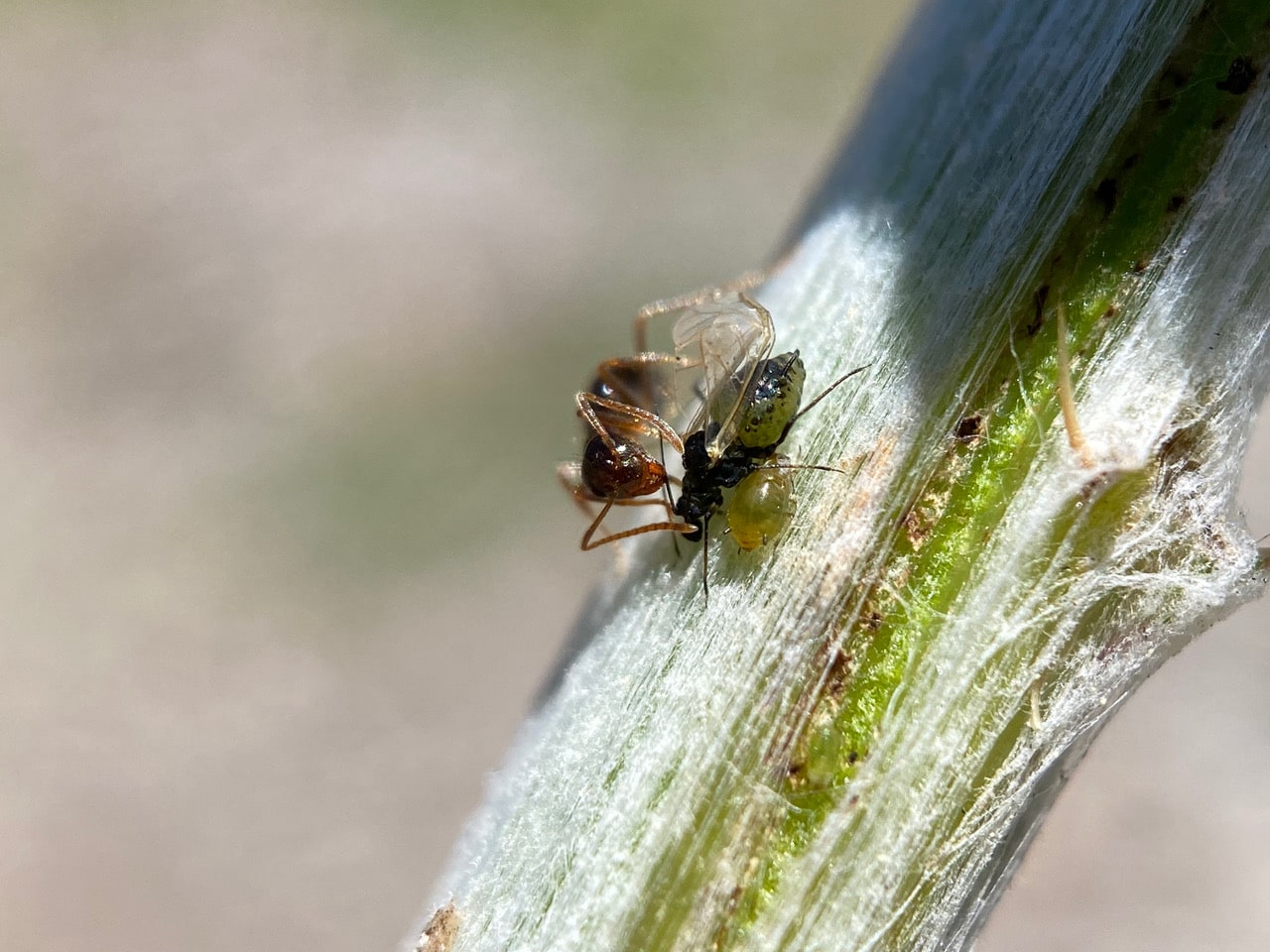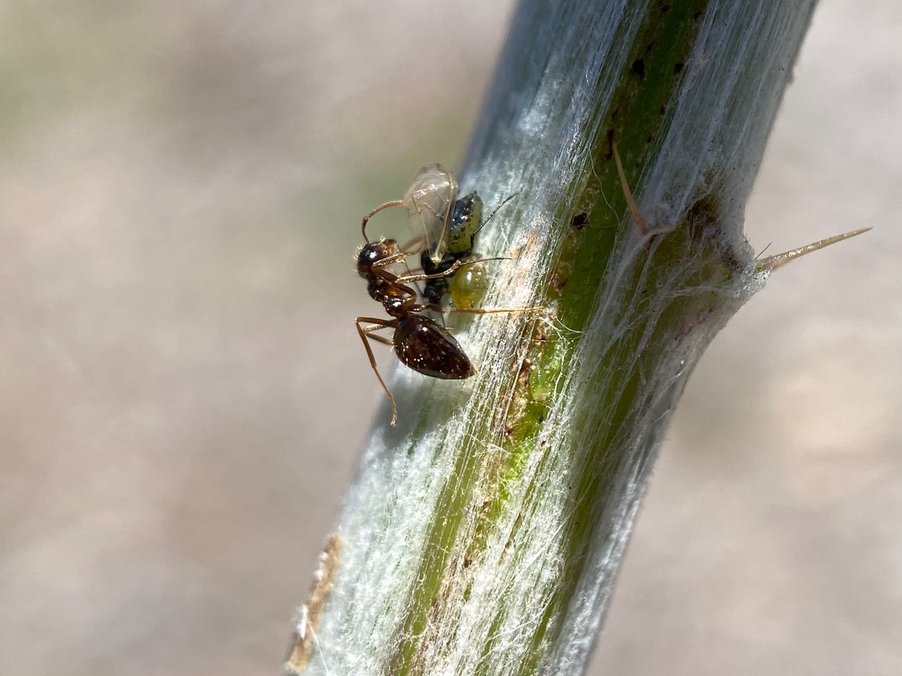 A few ants are gathered at a lesion on the stem of the Cobweb Thistle. What are the ants so excited about?