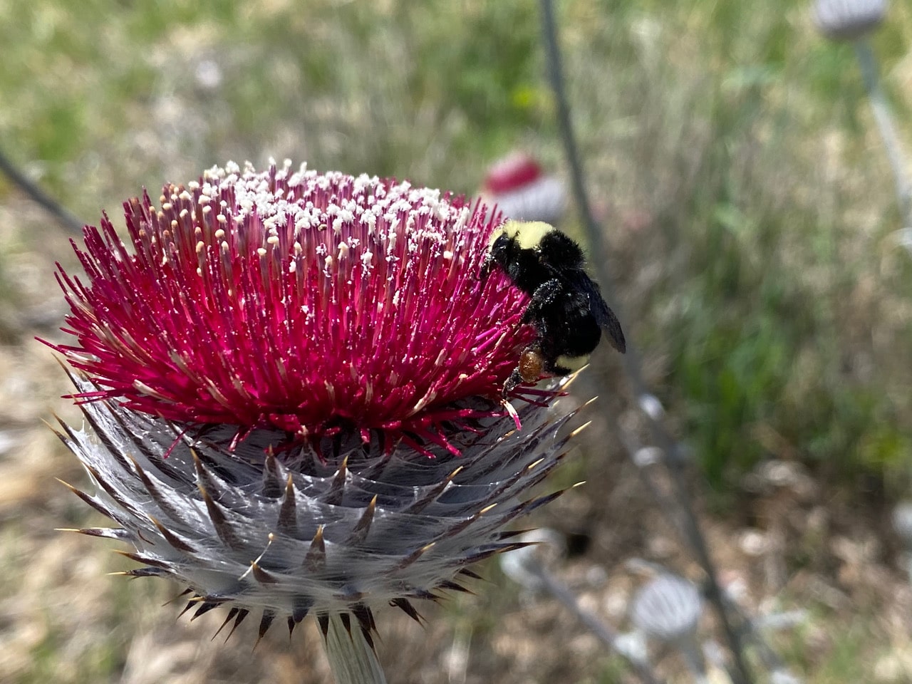 A Yellow-faced Bumble Bee, Bombus vosnesenskii lands on a fully opened Cobweb Thistle flowerhead to enjoy its abundance. She has her tongue out to sip nectar at the base of the florets. Another bee, probably a Digger Bee, Anthophora sp. is also visiting the thistle flowers while I am watching.