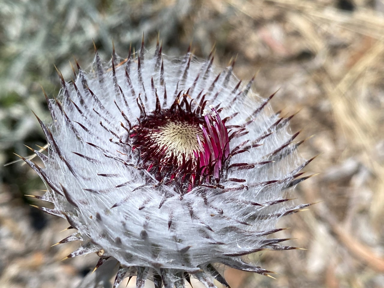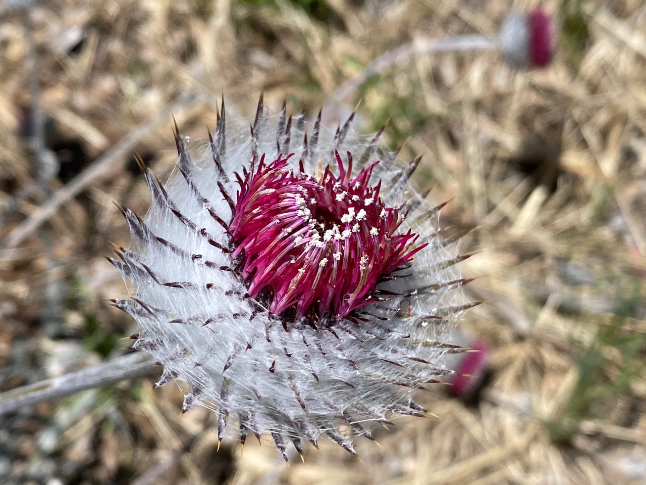 Thistles are unusual members of the sunflower family Asteraceae. Thistle flowerheads are composed of only disc florets; there are no ray florets. You may review the basic floral structure of Asteraceae here: Asteraceae