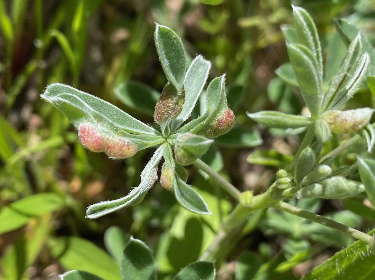Irregular lumps can be seen on some of the lupine leaves that are also folded along the midrib. These tumor-like growths are induced by the Leaf-fold-gall Midge, Dasineura lupinorum, family Cecidomyiidae. Females lay their eggs on unopened leaflets in growing buds. Newly hatched larvae crawl between the closed halves of the leaflets and begin feeding, stimulating formation of the swollen galls. The galls slowly become reddish over time, and contain several larvae each. The larvae complete development inside the gall and remain there through pupation. The midge produces several generations per year.