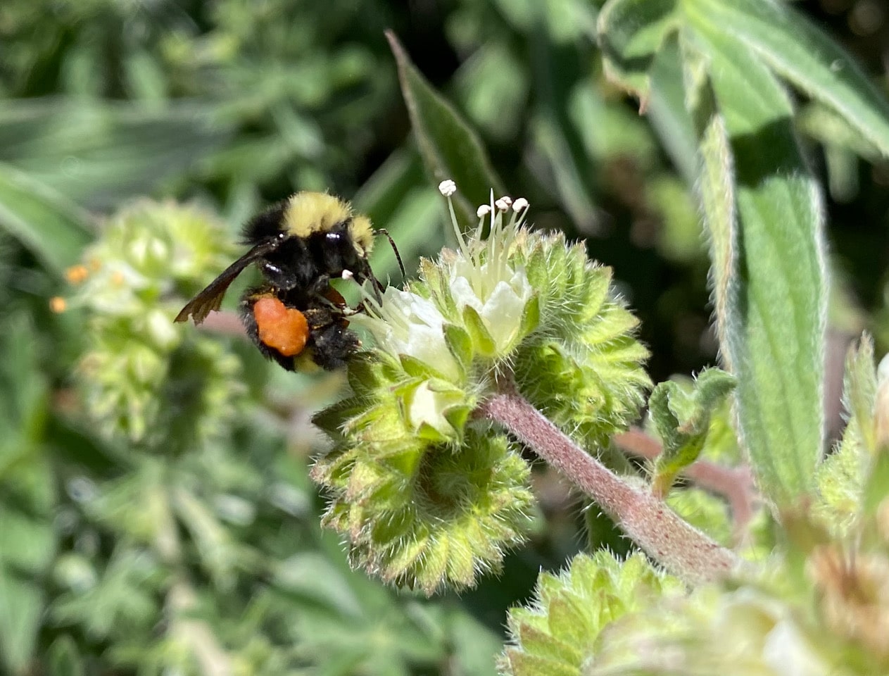 A Yellow-faced Bumble Bee, Bombus vosnesenskii is taking nectar from the flowers of Imbricate Phacelia, Phacelia imbricata. The huge load of orange pollen she is carrying in her pollen baskets is obviously not Phacelia pollen. She has probably collected it from California Poppy blooming close by. Pollen is protein-rich food, mainly fed to larvae, while nectar is an energy source both adults and larvae need.
