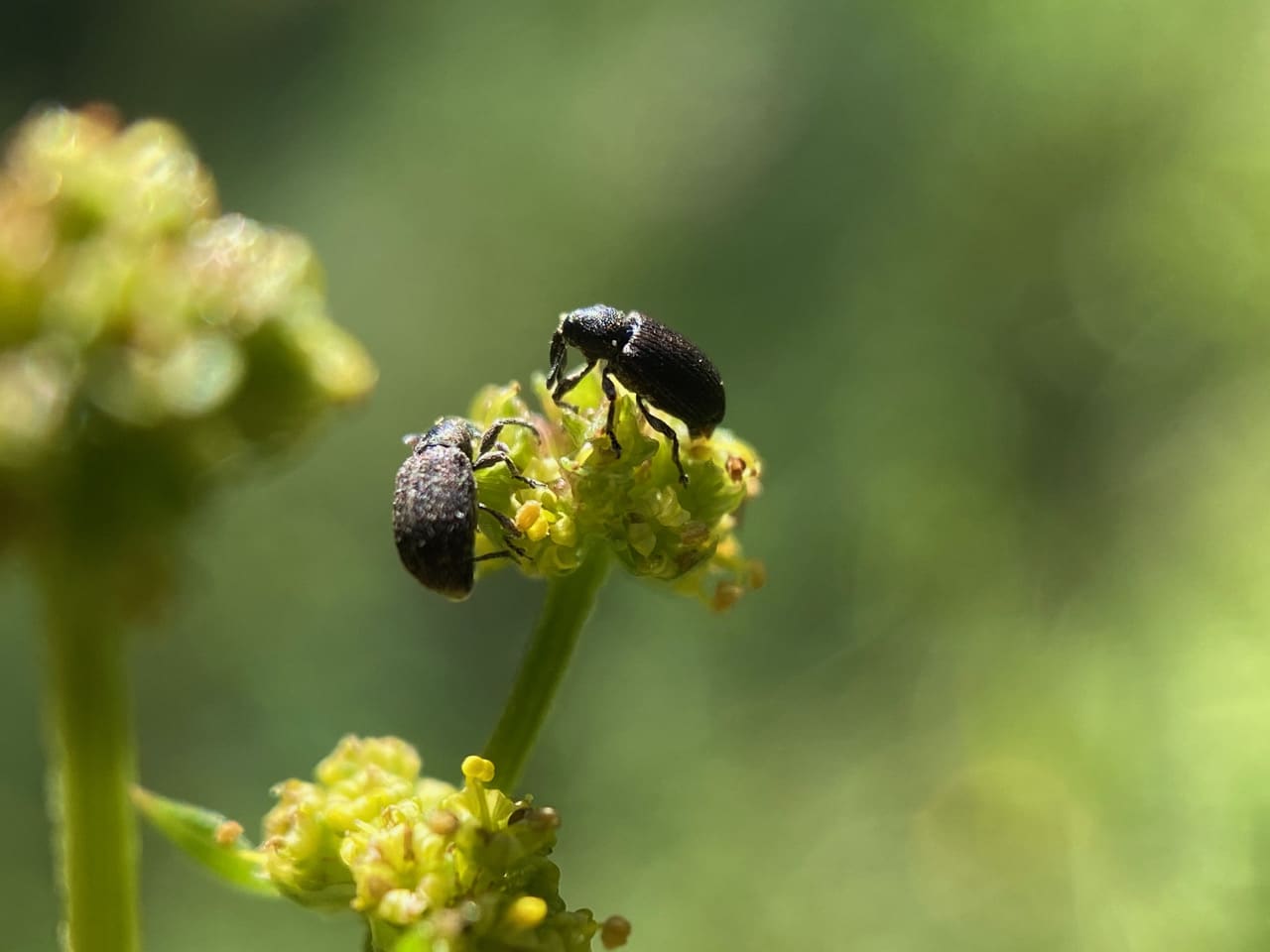 Two tiny black Weevils (family Curculionidae) are foraging on a cluster of flowers of Pacific Sanicle, Sanicula crassicaulis.