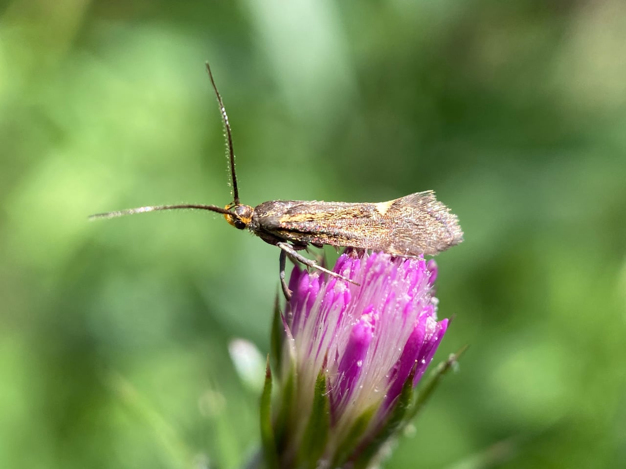 A small day-active moth, Sulphur Tubic, Esperia sulphurella (family Oecophoridae, or concealer moths) lands on a flowerhead of Italian Thistle.