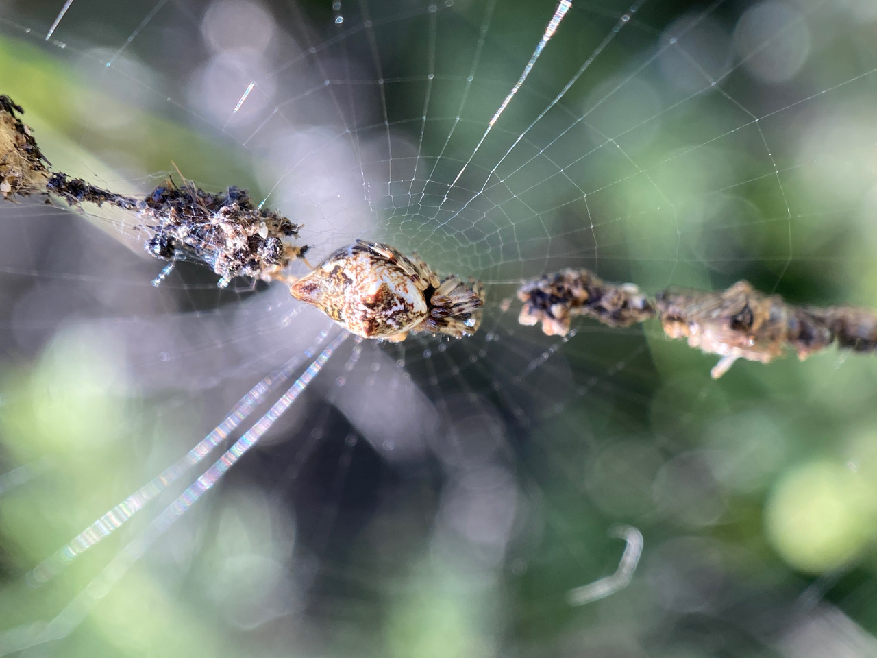 A little Humped Trashline Orbweaver, Cyclosa turbinata (family Araneidae) sits in the middle of its web that glints in the sun.