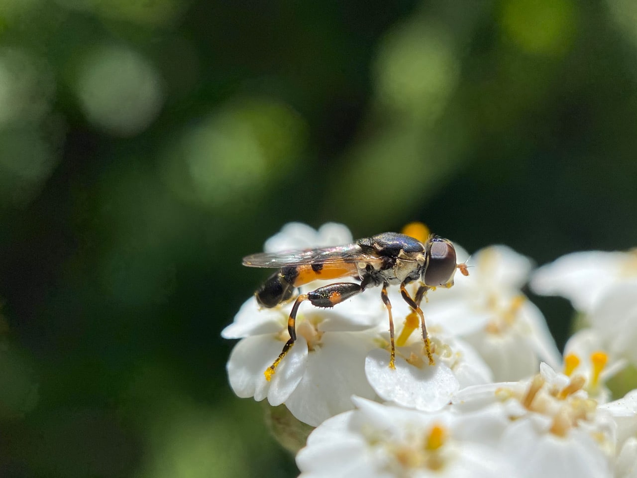Oh, look who else is here on the yarrow inflorescence – a Thick-legged Hover Fly, Syritta pipiens (family Syrphidae).