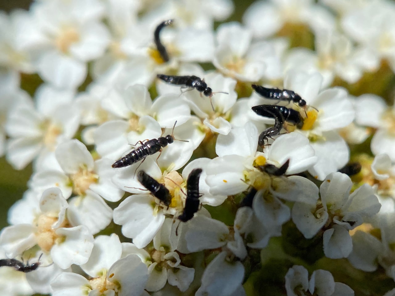 An inflorescence of Yarrow, Achillea millefolium seems to be writhing with what look like small, shiny black, elongated insects. They are very active and fast moving. It is difficult to see one clearly.
