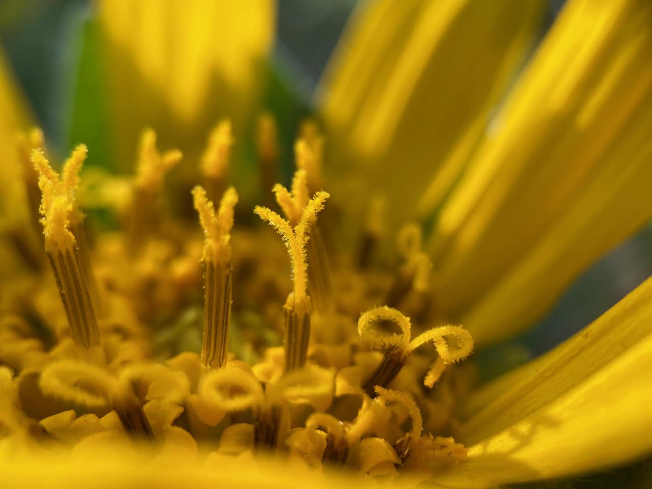 The late afternoon sun lights up the reproductive structures of disc flowers in a Mule Ears flowerhead beautifully. The flowers in focus are in their female phase. The two-lobed stigmas have pushed the pollen out of the anther tube ahead of them. When the pollen is gone, the two stigma lobes begin to curl apart to reveal their sticky inner surface to receive incoming pollen from other flowers. If the flower is not visited by a pollinator the two stigma lobes continue to curl downwards until they touch their own anther tube in search of leftover pollen grains. This is the flower’s Plan B – self-pollination is better than no pollination!
