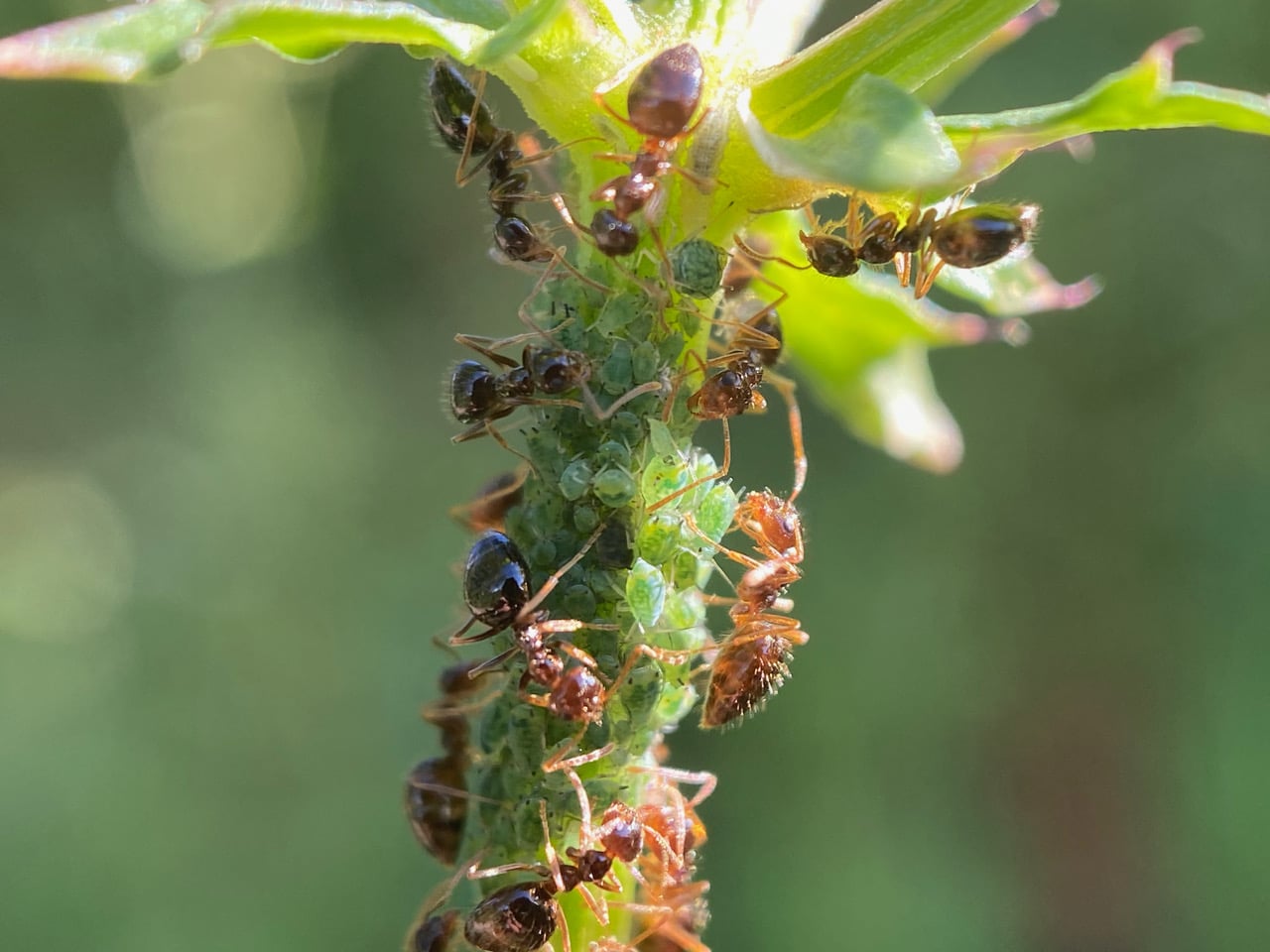 Some American Winter Ants, Prenolepis imparis are busy tending a dense aphid colony on a stem of Pacific Sanicle, Sanicula crassicaulis. The low afternoon sun lights up the bristles on the ants’ body that are usually hardly visible.
