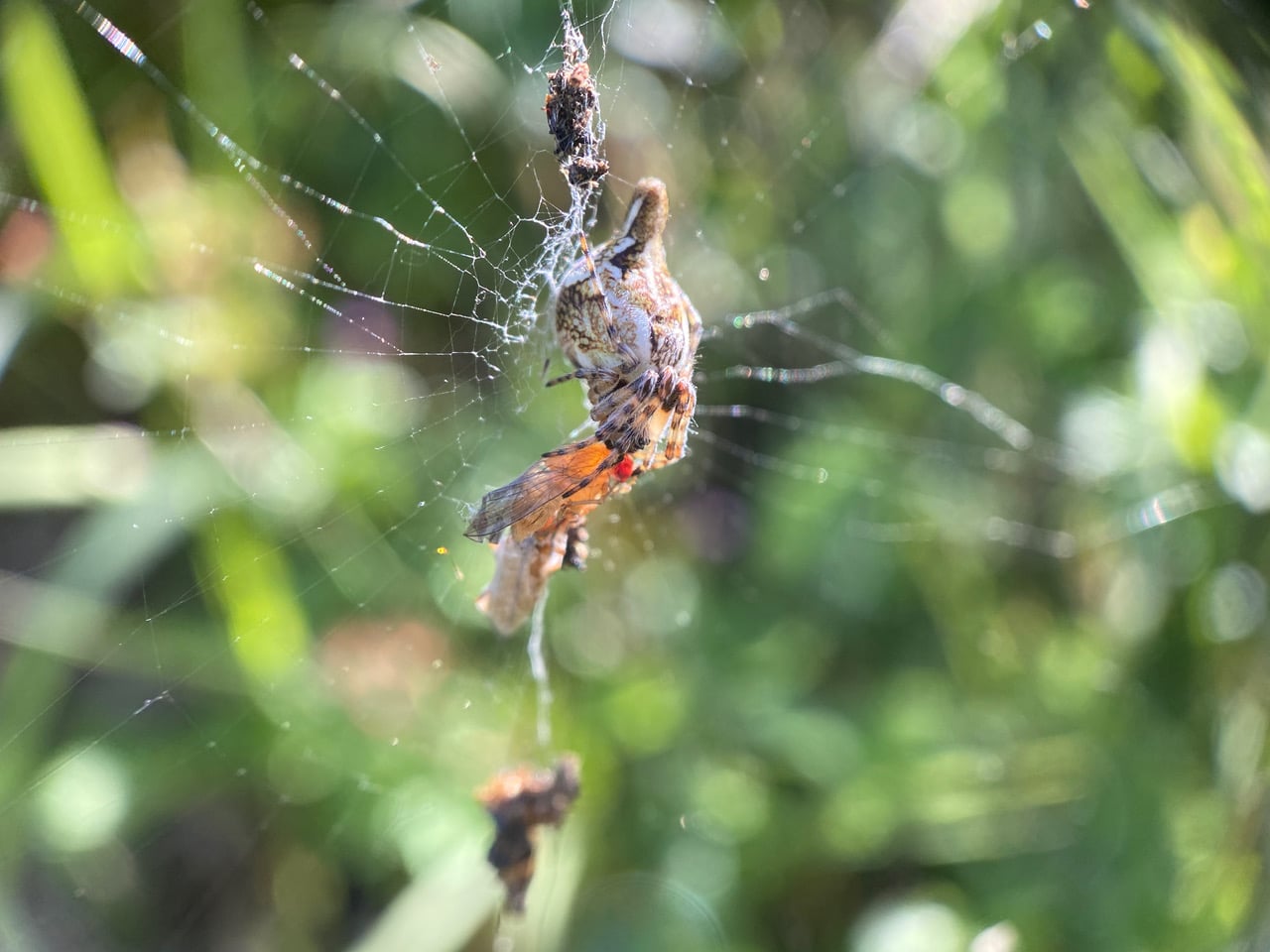Resting in the hub of her web, a Conical Trashline Orbweaver, Cyclosa conica (family Araneidae) is feeding on a fly! It’s the back-lit red eye of the fresh prey that caught my attention.