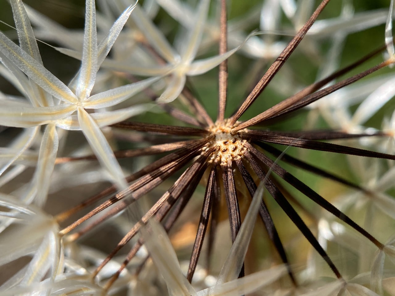 I peek through the gap of a Silverpuffs seed head that has shed some seeds. What a beautiful, orderly arrangement in there! The long, brown, ribbed seeds are each attached to a papery pappus that looks like a silver star.