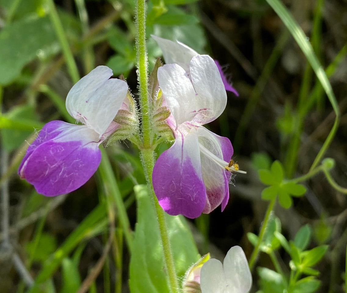 The flower on the right has been “tripped” by a bumble bee. The keel is agape, allowing the reproductive structures to escape. Note the stamens and the longer, protruding style/stigma.