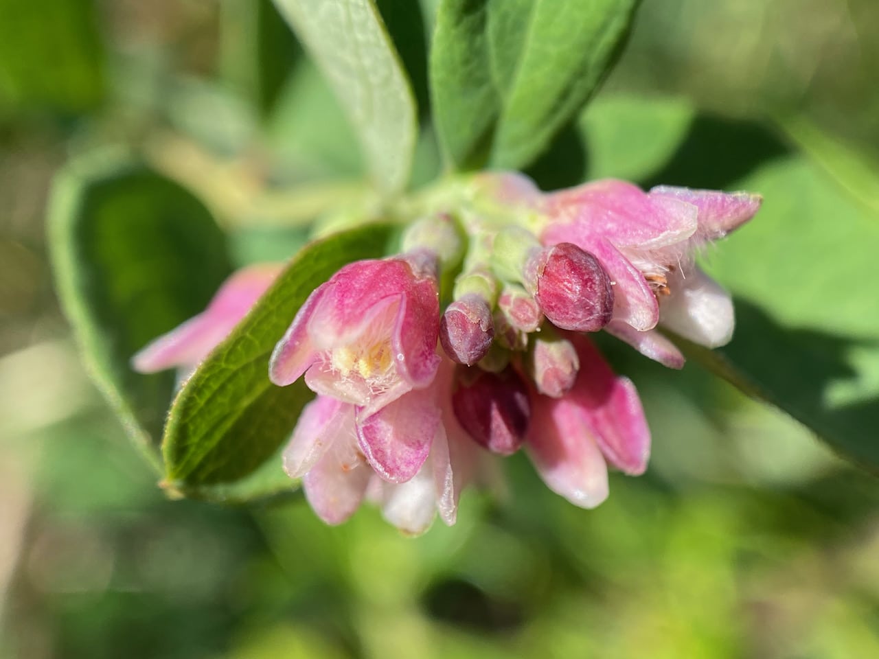 A nodding cluster of small pink flowers hangs on the tip of a Common Snowberry, Symphoricarpos albus var. laevigatus. A large Yellow-faced Bumble Bee flies around visiting these blooms along the lower slopes of Skyline Trail. Like their relative the Manzanitas, the flowers of Snowberry are pollinated by bumble bees by buzz pollination or sonication. The bee hangs upside down on the flowers, clasping them with its legs, and vibrates its wing muscles vigorously to shake the pollen out of the poricidal anthers. The pollen grains that land on the bee’s body are gathered into the pollen baskets on her legs to be transported back to the hive.