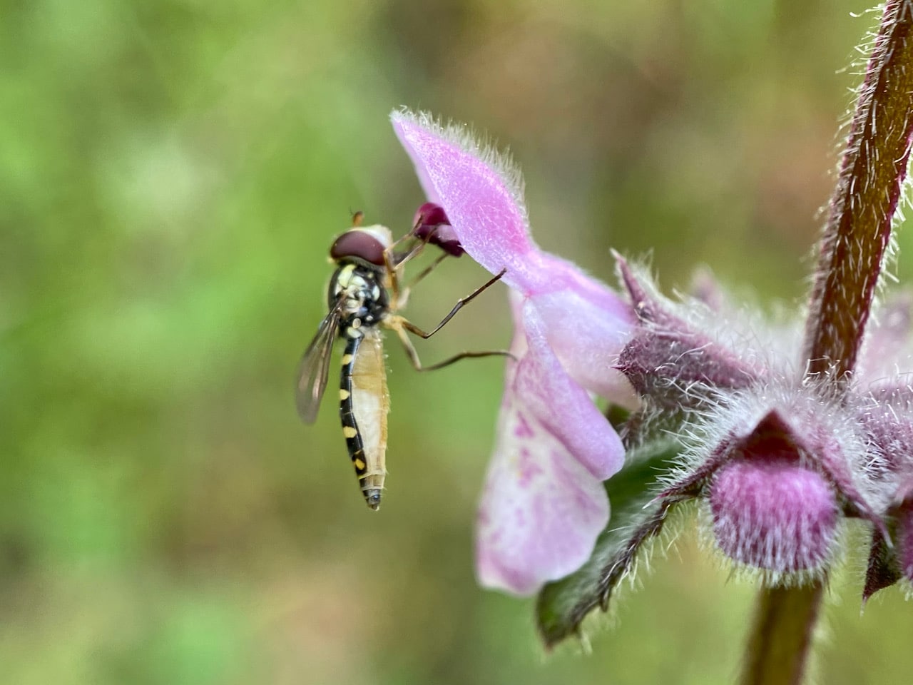 A female Globetail Hoverfly, Sphaerophoria sp. (Syrphidae) is feeding on the pollen of a Wood Mint flower, Stachys ajugoides. The hoverfly’s abdomen looks like a hollow husk!